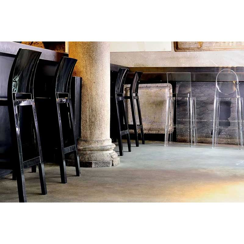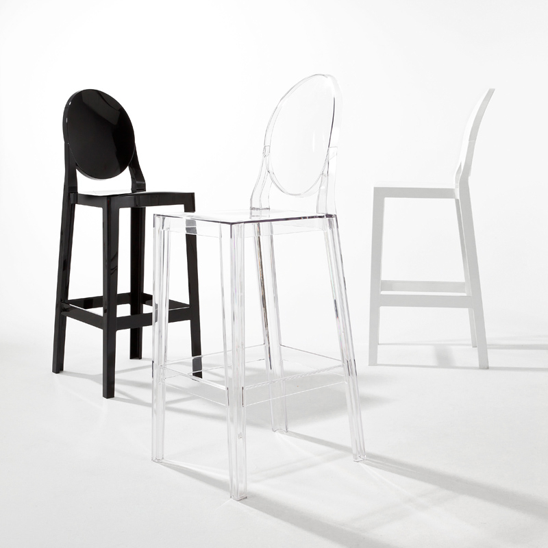 Produced by Kartell, the renowned Ghost collection presents a new selection of stools created by Philippe Starck. Spotted at the 2012 Milan Furniture Fair, One More stool, with a round backrest, and One More Please stool, with a square backrest, are destined to become design icons in their own right. Explaining the choice of names for the stools, Philippe Starck simply and originally says: "If you want to sip a cocktail at the bar in peace and quiet, all you need is a comfortable tall stool with a back to lean against. Sometimes one drink is not enough - and you need "One more" and sometimes "One more please"". Easy to move and comfortable, resistant and lightweight thanks to their polycarbonate frames, these stools are perfect and can be used in your American-style kitchen or around a bar to show off their strong and charismatic personality, with a practical and festive design.