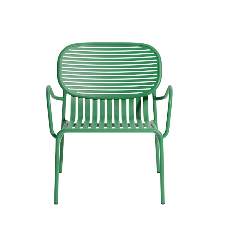 With Week-End, the French brand Petite Friture, sets its singular gaze on summer and proposes with the studio Brichet-Ziegler a graphic and contemporary approach to garden furniture. This one is played with a rhythm of horizontal and vertical bands skillfully placed on a structure with strong lines. The strips of this armchair that characterize the Week-End collection published by Petite Friture, are made from laser-cut aluminium sheets in a single piece and not assembled slats, allow the removal of screws or uncomfortable welds. The work of horizontal and vertical slats, like stripes, emphasizes solids and voids, affirming the identity of the collection. The Week-End collection is a complete range of outdoor furniture. The precise colors selected for this collection mark alone or in combination the skyline of a balcony, terrace or garden. This armchair is available in several colors such as black, yellow, jade green ... The colouring of the Week-end collection, by Petite Friture, in a grained anti-UV epoxy powder paint guarantees an impeccable maintenance of the hues over time. The design armchair proposed by Petite Friture, was designed with the obsession to make the most of materials and techniques available to designers. Made of aluminium, a material selected for its lightness and weather resistance, the collection Week-End combines aesthetic comfort and practicality. Indeed, this collection is resolutely designed around a practical use because all the seats are stackable.