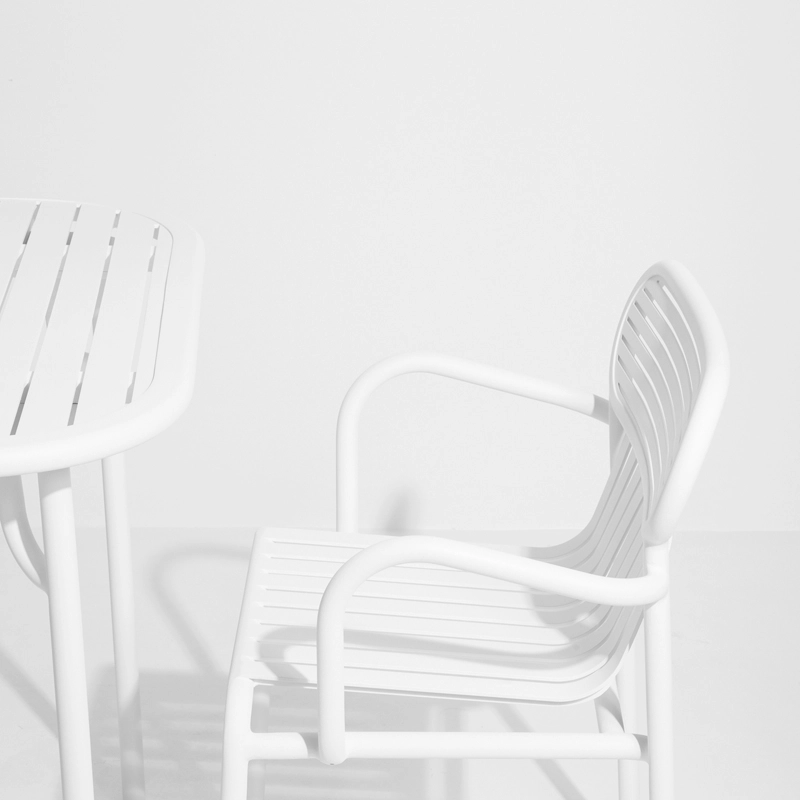With Week-End, the French brand Petite Friture, casts its singular gaze on summer and proposes with the Studio Brichet-Ziegler a graphic and contemporary approach to garden furniture. This one is played with a rhythm of horizontal and vertical bands skillfully placed on a structure with strong lines. The strips of this small armchair that characterize the Week-End collection published by Petite Friture, are made from laser-cut aluminium sheets in a single piece and not assembled slats, allow the removal of screws or uncomfortable welds. The work of horizontal and vertical slats, like stripes, emphasizes solids and voids, affirming the identity of the collection. The Week-End collection is a complete range of outdoor furniture. The precise colors selected for this collection mark alone or in combination the skyline of a balcony, terrace or garden. This small armchair is available in several colors such as black, yellow, jade green ... The colouring of the collection Weekend, from Petite Friture, in grained UV epoxy powder paint guarantees impeccable shade retention over time. The small armchair design Weekend proposed by Petite Friture was designed with the obsession of making the most of the materials and production techniques available to designers. Made of aluminium, a material selected for its lightness and weather resistance, the Week-End collection combines aesthetic comfort and practicality. Indeed, this collection is resolutely designed around a practical use because all the seats are stackable.