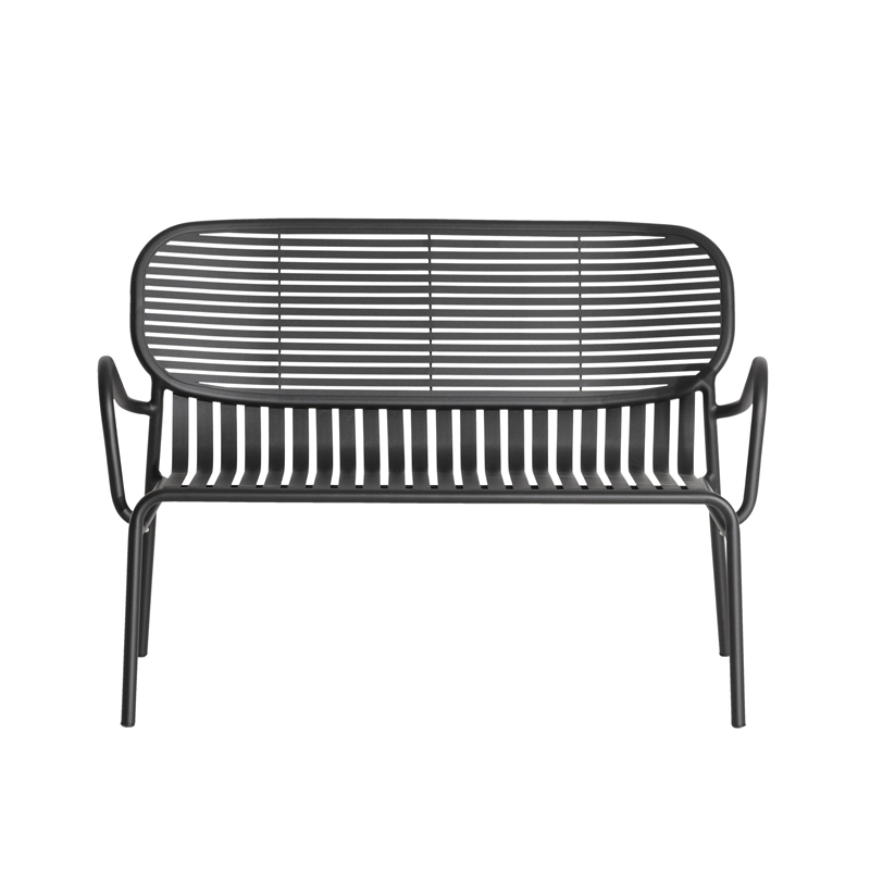 With Week-End, the French brand Petite Friture sets its singular gaze on summer and offers with the studio Brichet-Ziegler a graphic and contemporary approach to garden furniture. This one is played with a rhythm of horizontal and vertical bands skillfully placed on a structure with strong lines. The strips of this outdoor sofa that characterize the Week-End collection published by Petite Friture, are made from laser-cut aluminium sheets in a single piece and not assembled slats, allow the removal of uncomfortable screws or welds. The work of horizontal and vertical slats, like stripes, emphasizes solids and voids, affirming the identity of the collection. The Week-End collection is a complete range of outdoor furniture. The precise colors selected for this collection mark alone or in combination the skyline of a balcony, terrace or garden. This bench is available in several colors such as black, yellow, jade green ... The colouring of the Week-end collection, by Petite Friture, in a grained anti-UV epoxy powder paint guarantees an impeccable maintenance of the hues over time. The design bench proposed by Petite Friture, was designed with the obsession to make the most of materials and techniques available to designers. Made of aluminium, a material selected for its lightness and weather resistance, the Week-End collection combines aesthetic comfort and practicality. Indeed, this collection is resolutely designed around a practical use because all the seats are stackable.