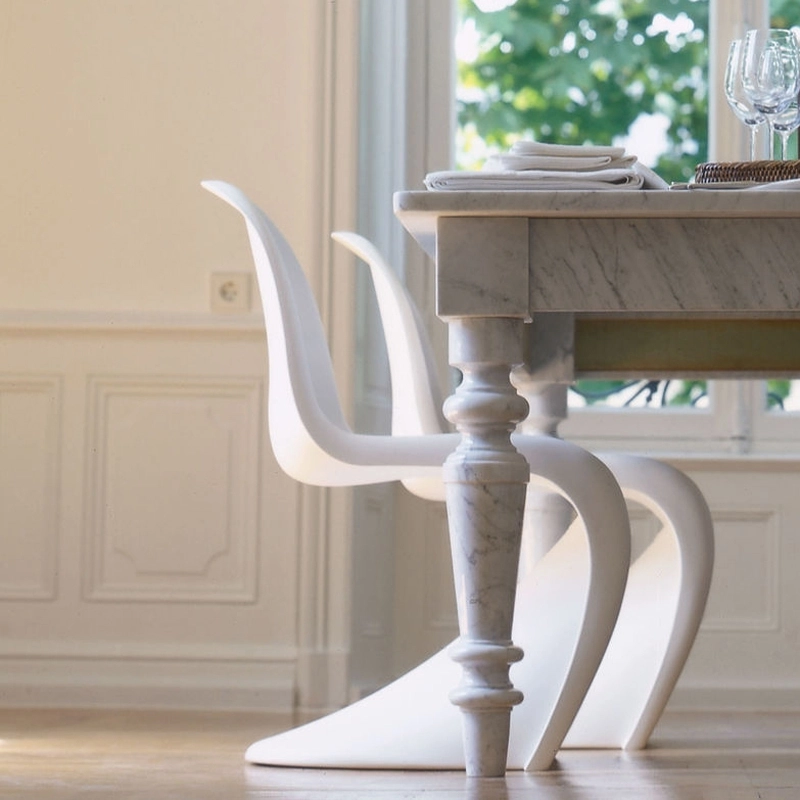 The Panton chair, created by Verner Panton in the 1960s, is a true icon in the history of furniture. Verner Panton was one of the most influential designers of the 1960s and 1970s. Born in Denmark, he moved to Switzerland when the Panton chair was developed. A virtuoso of colour, he is responsible for a number of lighting and textile pieces. Here, the ambition of this genius designer was to create a chair moulded in a single piece that would be comfortable and suitable for universal use. The Panton chair marked the history of design both by its form and the technique used to produce it. Indeed, the Panton chair was the first plastic chair made from a single piece. The result of several years of research in collaboration with Vitra, the Panton Chair was first presented in 1967. It was also from this date that it went into series production. The Panton chair is a classic in the history of furniture to which the designer gave his name. It won numerous awards and was one of the first chairs to be included in the permanent exhibitions of the Museum of Modern Art in New York. Free-swinging seat technology combined with a shape adapted to the human form and soft material give this chair a high degree of comfort. The comfort of the chaise Panton has as much to do with its organic shape as with the suppleness of its material. Since its creation, the Panton Chair has gone through several manufacturing phases linked to the technical advances made in plastics processing. It was at the end of the 90s that Vitra created the last version of the seat authorised by the designer. This 100% polypropylene version made it possible to offer this chair as a low-cost industrial product. On this chair, special additives slow down the fading caused by ultraviolet rays. It is also available in its original 1960 version, the Panton Classic, and in a children's version.