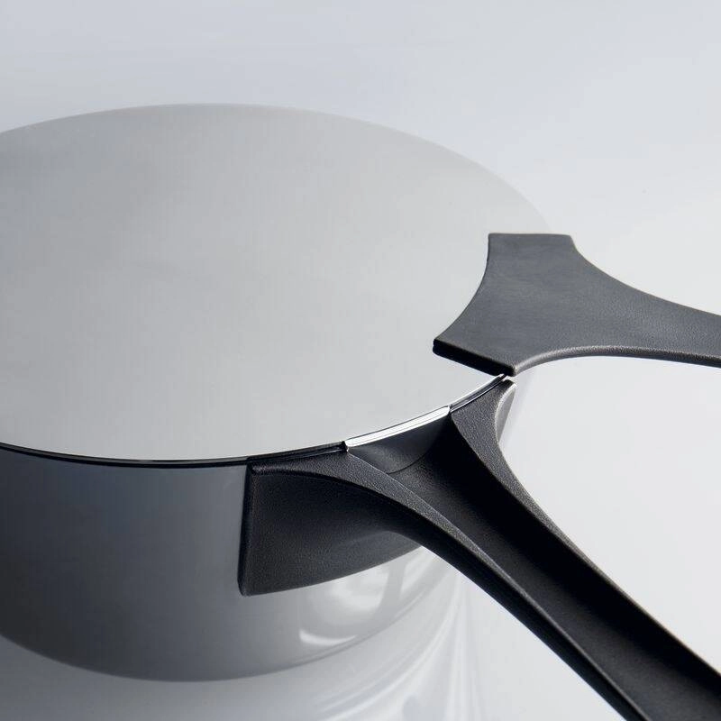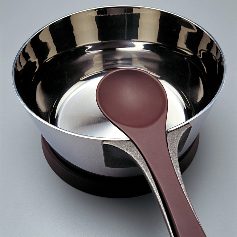 Pasta Pot is a pasta cooking utensil created by the famous designer Patrick Jouin in collaboration with the prestigious multi-starred chef Alain Ducasse, for Alessi in 2007. This cookware set includes a long-handled multi-ply saucepan, a glossy 18/10 stainless steel lid, a spoon and a melamine trivet. Pasta Pot represents a real culinary revolution, enabling pasta to be cooked with a minimum of water. This technique is inspired by the method of cooking used in the past by the millers: "It is this traditional method that I have revived in my restaurant Le Louis XV in Monaco". (A. Ducasse). All the starches are fully absorbed by the pasta, as is the sauce, like a risotto, giving the dish an incomparable flavour. The advantage of this design object is that you no longer need a colander or serving dish - the Pasta Pot is self-sufficient and will quickly find its place on the kitchen worktop. What's more, the cooking spoon fits perfectly into the handle, and is made from melamine, so you'll never burn yourself when you pick it up.