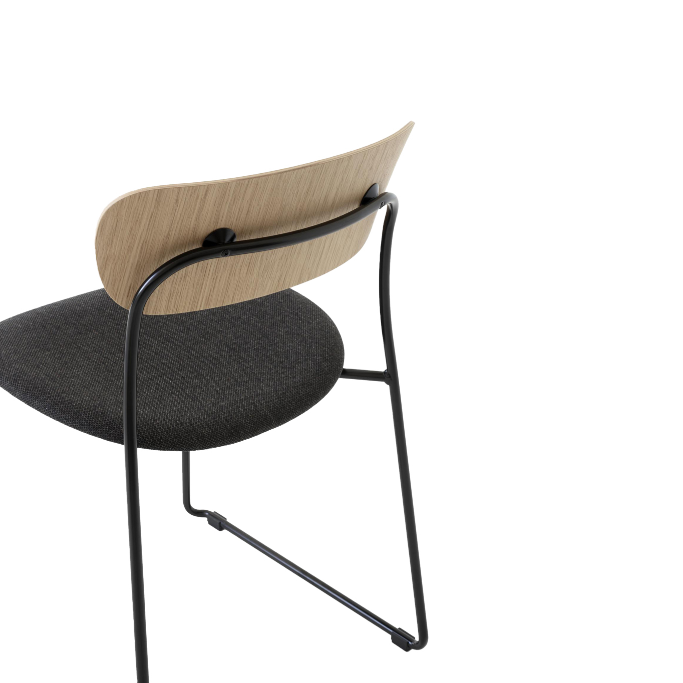 Water based lacquered oak veneer back, HR foam, fabric upholstery seat and powder coated, steel base