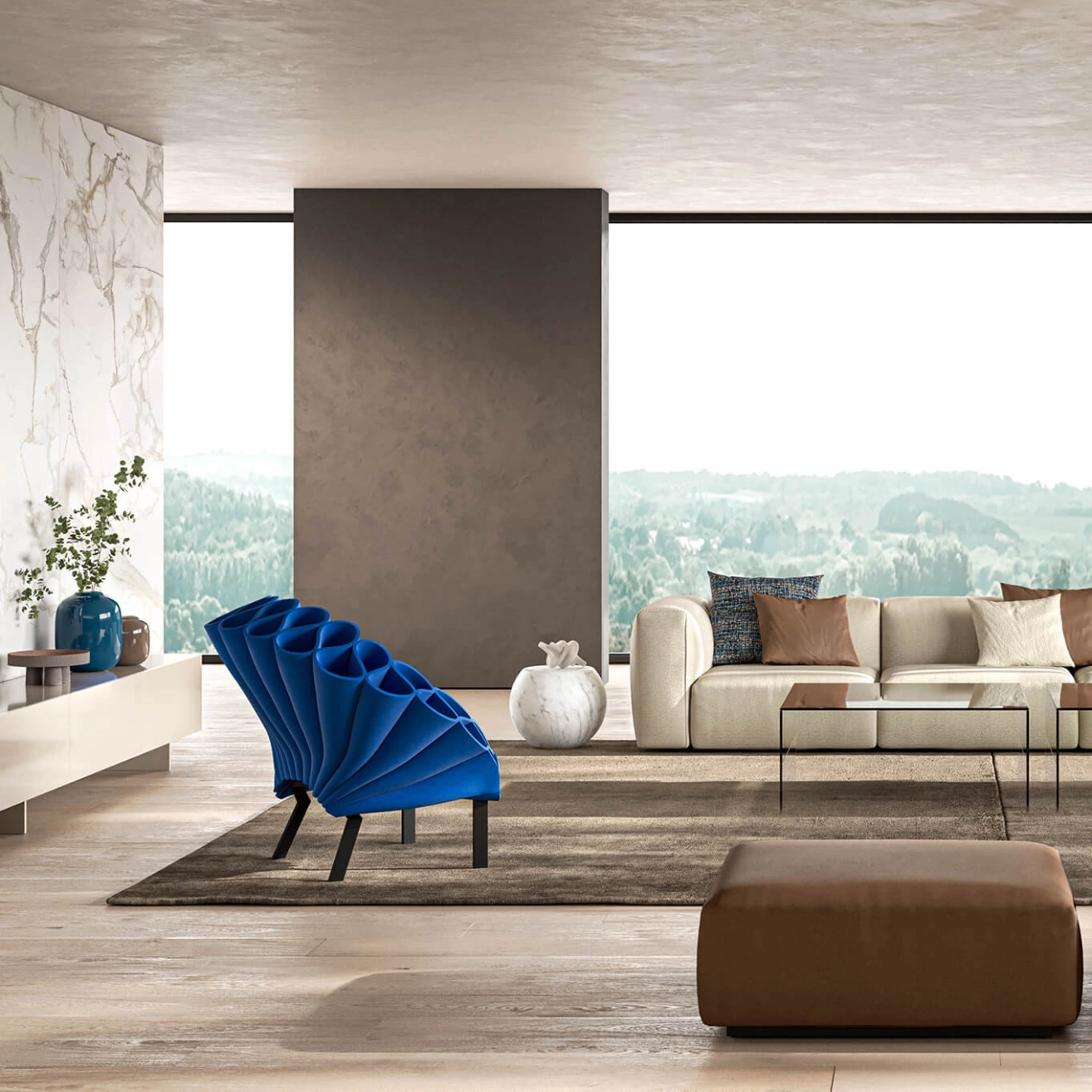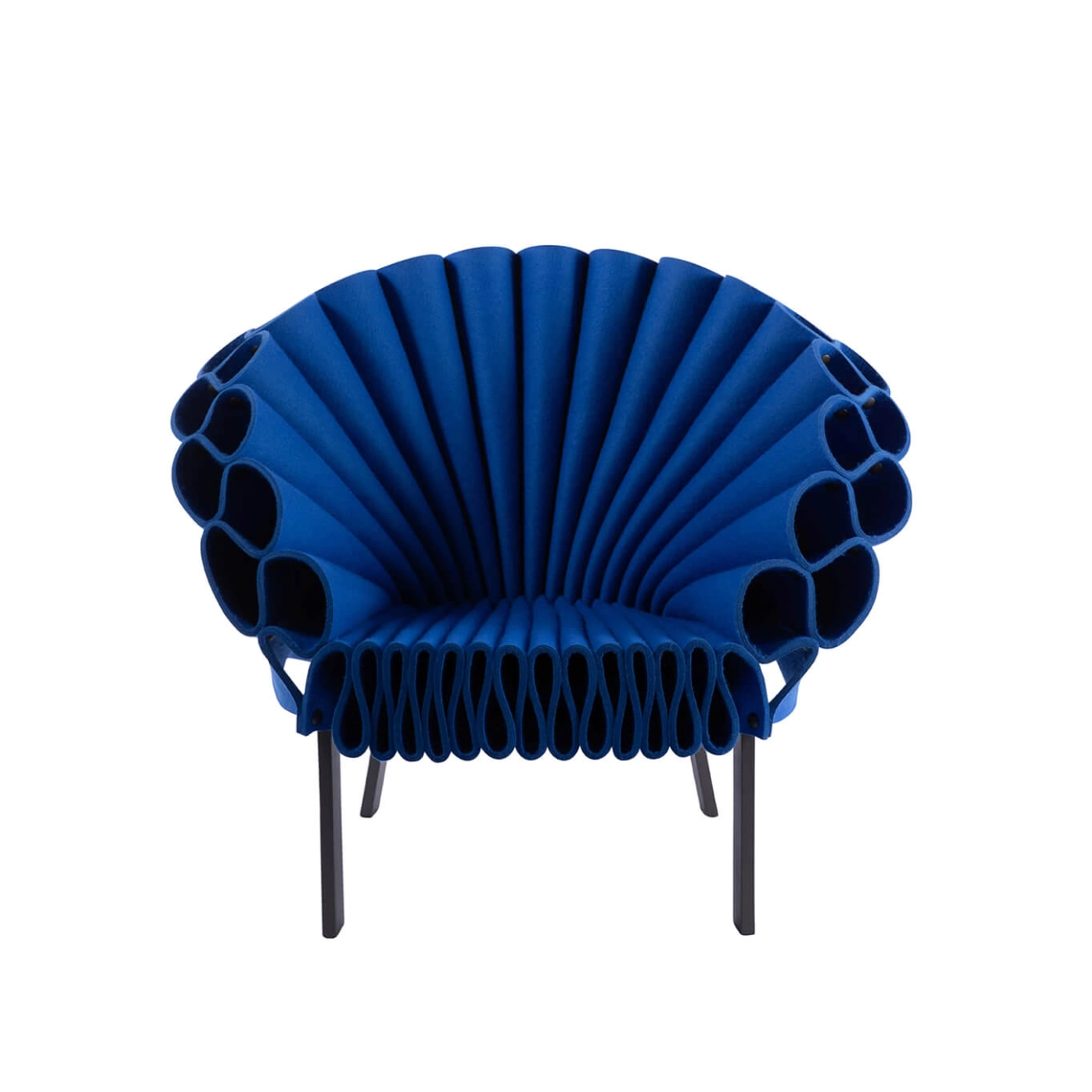 The Dror studio has collaborated with Cappellini to create an original chair, imitating the peacock tail, hence the name "Peacock" in English. The seat is made entirely from the folded felt fabric fixed to a dark brown epoxy painted metal frame. Felt has two functions here: it serves as a covering and padding at the same time. Thanks to the pleating, the fabric also becomes a three-dimensional structure. In the living room, Peacock is as surprising for its sculptural look as it is for its high level of comfort.