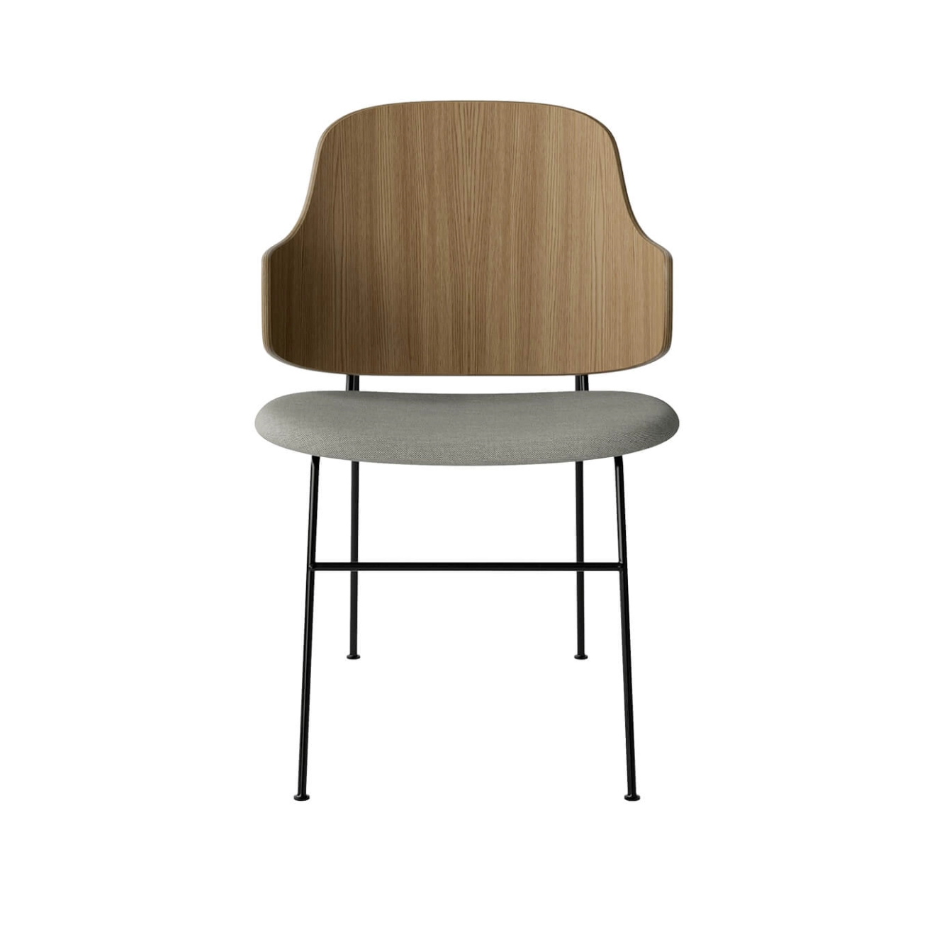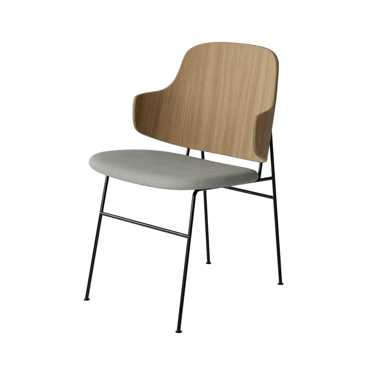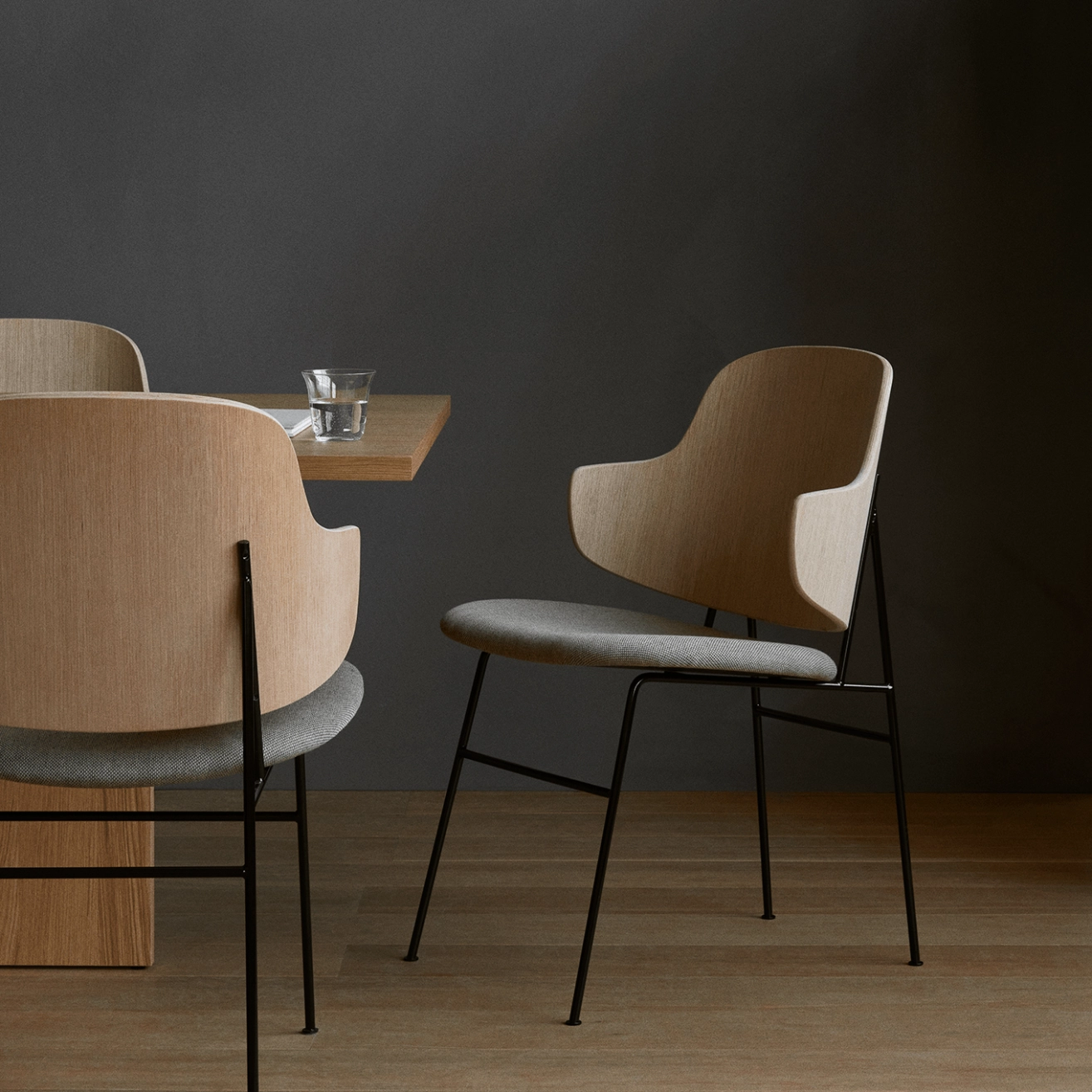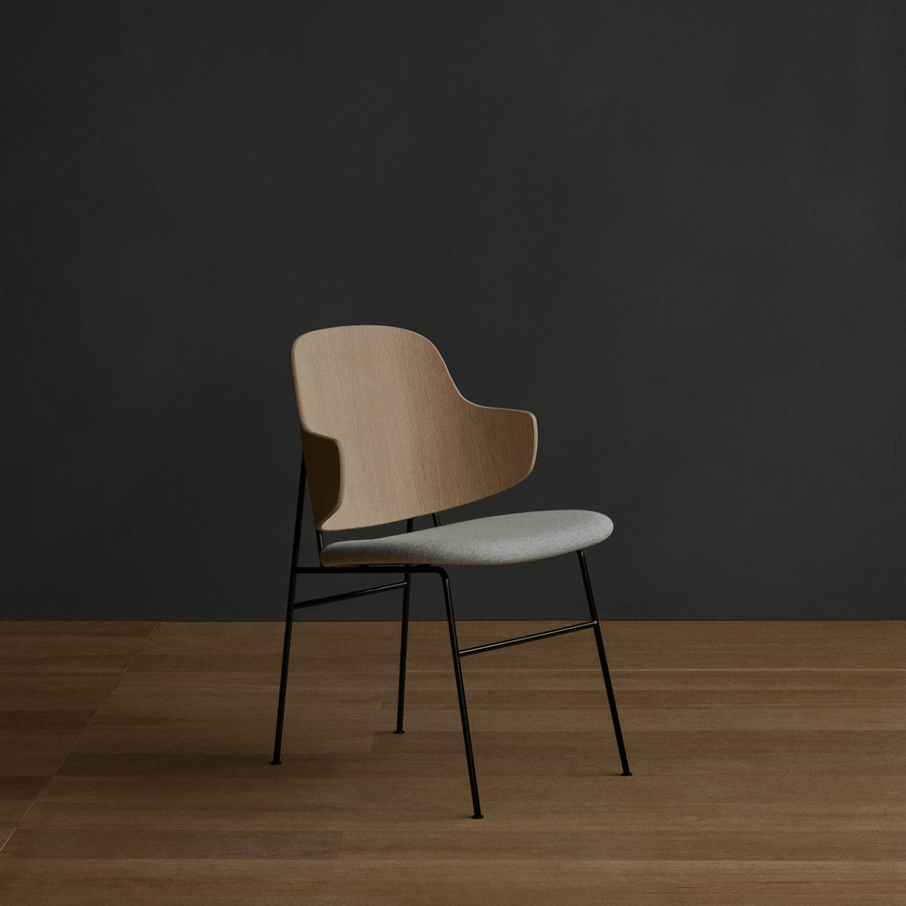 The PENGUIN Oak chair Re-Wwool 218 embodies the subtle alliance between modernist heritage and contemporary sensitivity, signature of Audo Copenhagen. Its emblematic curved backrest, with an enveloping and fluid silhouette, dialogues with the luminous warmth of natural oak, while the seat dressed in Re-Wine 218 textile brings a tactile and sophisticated dimension to the whole. The balance between woody structure and textile comfort reveals a piece that is both expressive and perfectly mastered. Ideal around a high-end residential dining room table, in a restaurant, a meeting room or a demanding hotel project, the PENGUIN offers a comfortable and ergonomic seat, designed to accompany extended uses with elegance. The natural oak blends harmoniously into light and mineral palettes, while the Re-Wine coating 218, with its rich and nuanced texture, reinforces the feeling of comfort and refinement. The contrast between the rigor of the structure and the softness of the textile creates a balanced dialogue, capable of enhancing both refined environments and more sophisticated compositions. Its design is based on a precise research of proportions and curves, reflecting a sustainable vision where aesthetics, functionality and comfort are clearly matched. The PENGUIN Oak Chair Re-Wwool 218 stands out for the iconicity of its sculptural backrest, for the nobility of its wood, for the enveloping quality of its upholstery, and for its ability to integrate naturally into refined residential or contract projects.