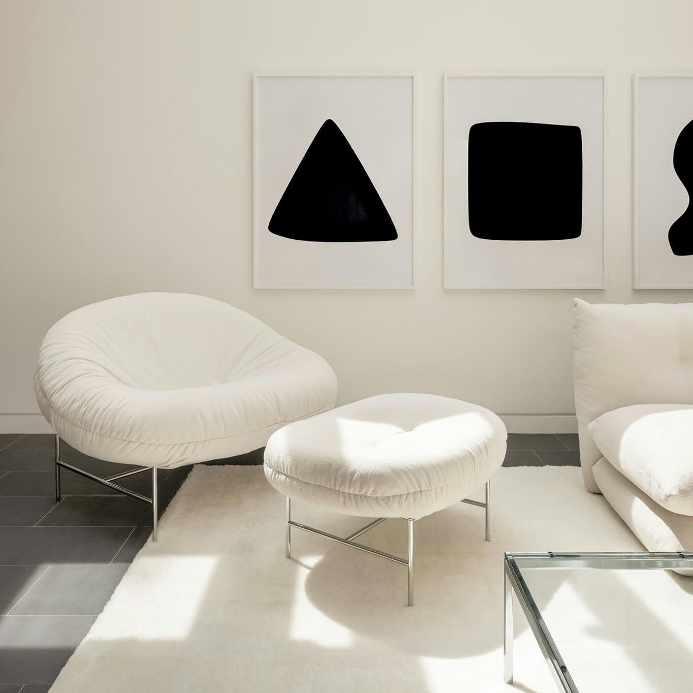 Designer and creative director Willo Perron blurs the lines between lounge chair, sofa, and bed with his Perron Bun Lounge Chair designed for Knoll. Its generous and plush seat welcomes a wide range of cozy and curled-up positions, while the elegant curves of the suspended base enhance the feeling of comfort and relaxation. A truly inviting and laid-back cocoon. Like a plush cloud floating above a sculpture. Le pouf Perron Bun est idéal pour ajouter une touche supplémentaire de confort. The welcoming roundness of the mattress-like cushion is as visually pleasing as it is physically comfortable. It transforms the atmosphere of a room without overpowering its surroundings. Can be paired with the Perron Bun Ottoman (sold separately).