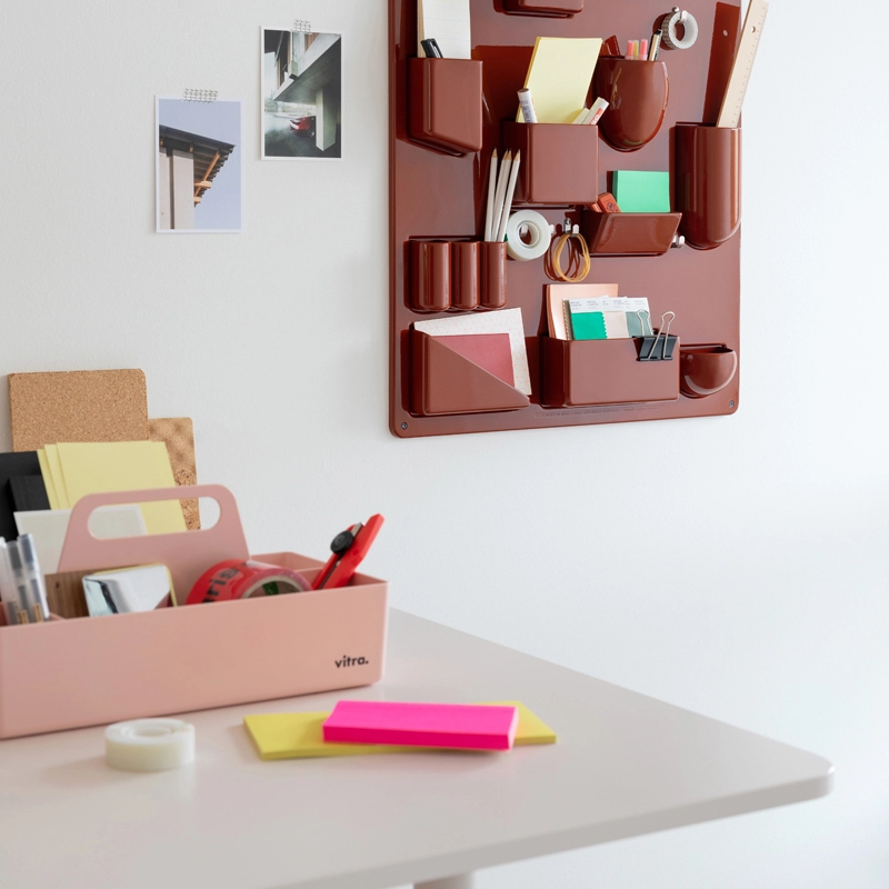 Toolbox is a organiser designed by Arik Levy for the Vitra brand. Toolbox is a practical everyday tool for storing and transporting small utensils and work accessories. The Toolbox RE organiser is made from recycled plastic. The high-quality recycling material comes from recycled household waste, in particular used packaging. What's more, at the end of its life, the organiser is also 100% recyclable. The colour of Toolbox shows very slight colour irregularities as the dark grey shade is the natural shade of the processed recycling material.