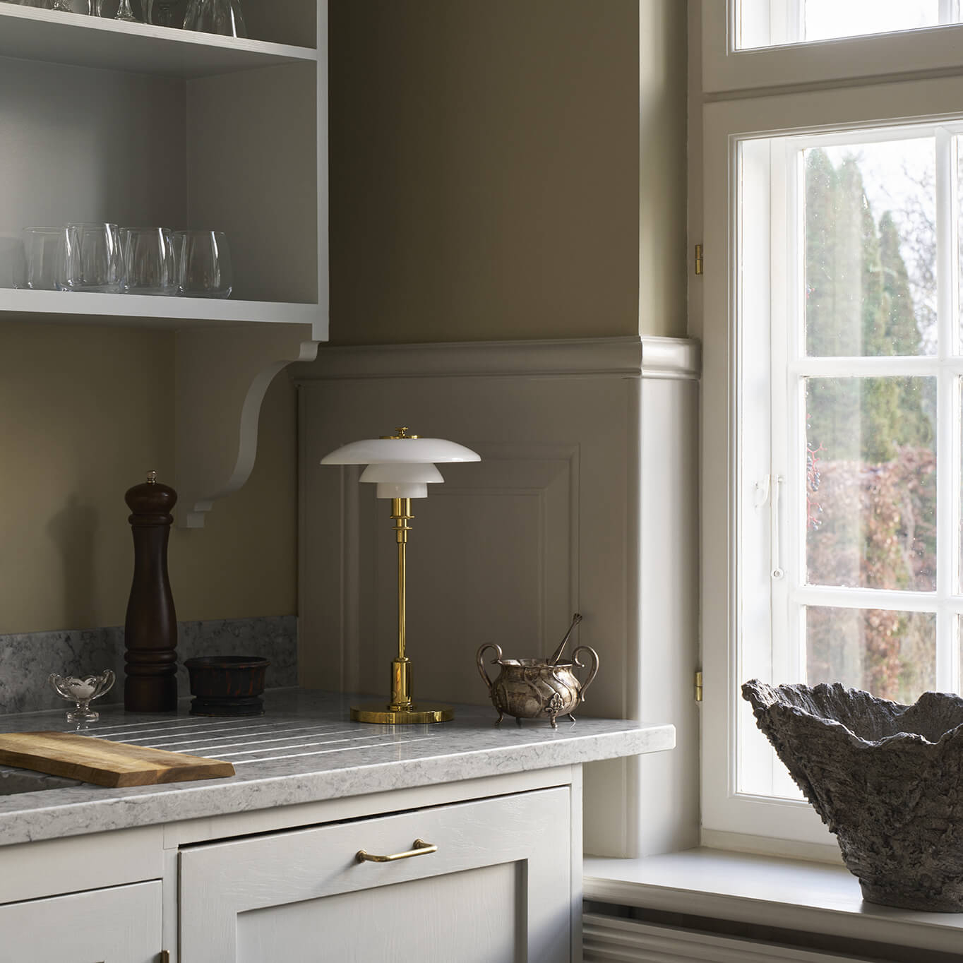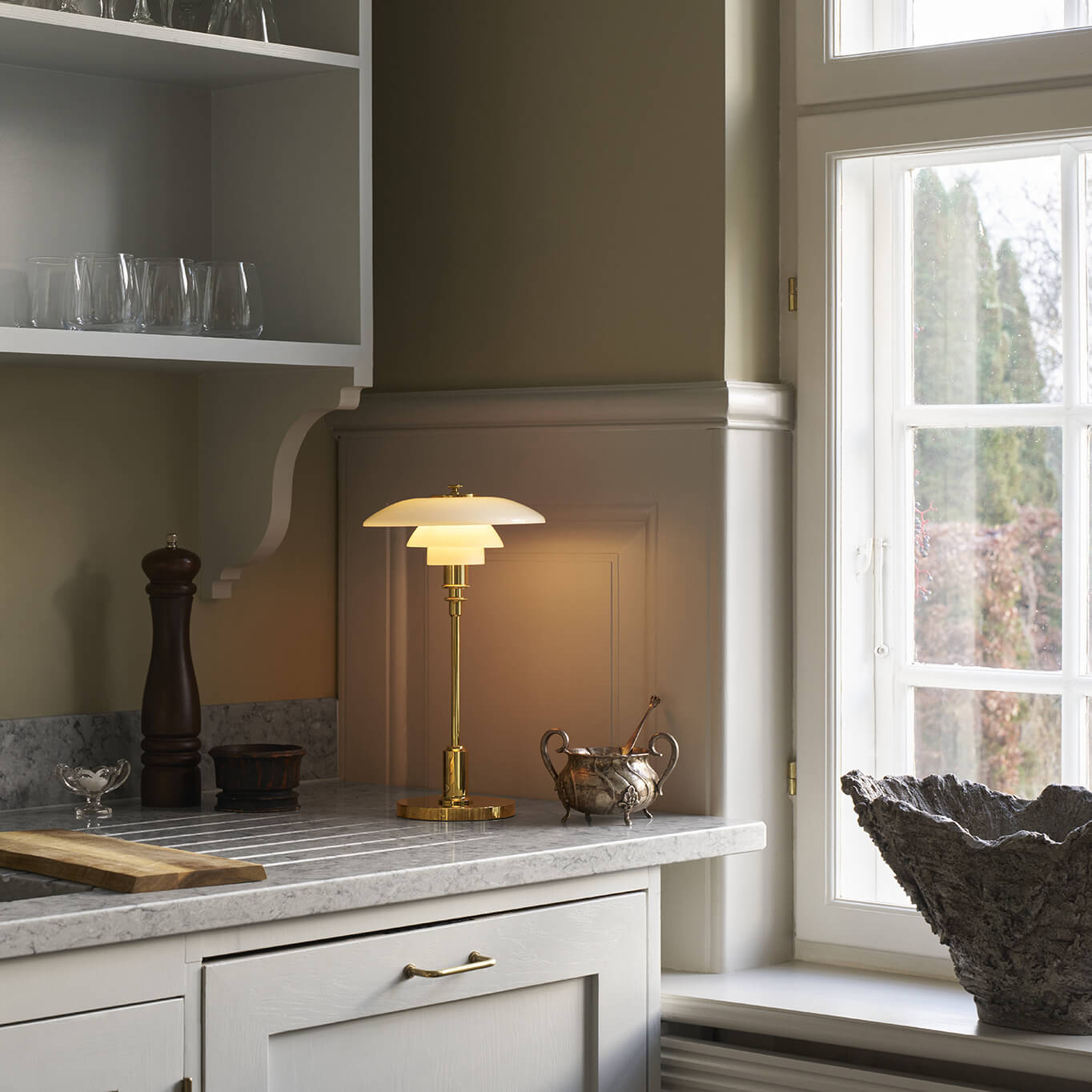 The PH 2/1 Portable is a cordless version of the classic small table lamp, with hand-blown opaline glass shades and a foot and base in shiny chrome or metallic brass. The portable version of the lamp is perfect for indoor and outdoor use, such as in a library or on a bedside table.