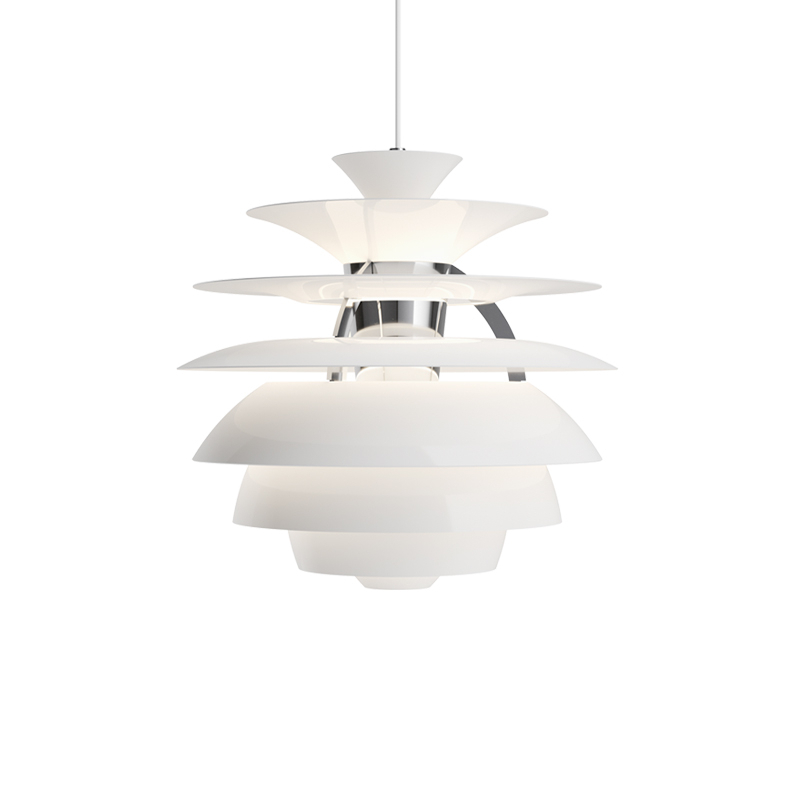 The PH Snowball pendant is considered a scaled back version of the famous PH Louvre lamp by Poul Henningsen made for the Adventist Church in Skodsborg, Denmark. Unlike the PH Louvre, the number of shades is reduced to eight, mounted on three rods, and the diameter of the lamp is also reduced due to the fact that it was designed for lower ceiling spaces. This lamp was first showcased in 1958 with the PH 5 and the PH Artichoke, but it did not receive the same attention as the other two pendants. It was only in 1983 that the design was revised and the lamp was finally produced. Now produced by Louis Poulsen, it is made with white lampshades with a shiny upper part to create sparkling light and a matt lower part to avoid reflections from the light source. When the light is switched on, the upper part is illuminated while the lower part remains deliberately dark.