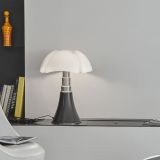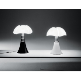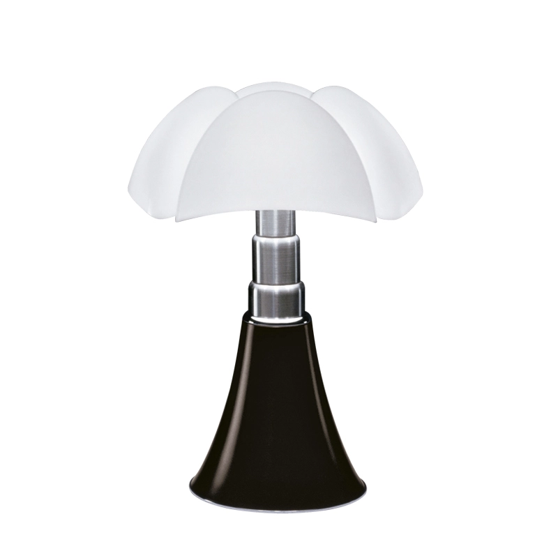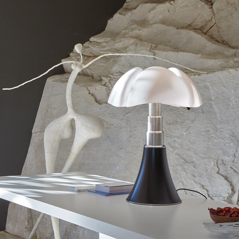 This design classic was designed in 1966 by Gae Aulenti, using techniques that were highly innovative for the time. The queen of Italian design for over 50 years, the Pipistrello Martinelli Luce table lamp features a metal tulip base, telescopic brushed stainless steel arm and opaline white methacrylate diffuser. The Pipistrello Martinelli Luce is a table or floor lamp with diffused light. A telescopic system enables the height to be adjusted between 66cm and 86cm. The base of the lampe Pipistrello Martinelli Luce is made of metal painted in very dark brown or white. The design of the diffuser is inspired by the wings of the pipistrello, the European bat from which it takes its name. The shape of the flared base expands in height, widening at the ribs of the diffuser like the wings of a bat. The diffused light that the Pipistrello Martinelli Luce reflects and the ingenuity of its telescopic arm have helped build the success it enjoys today. Pipistrello Martinelli Luce is a timeless object and has made the rounds of all the world's greatest museums. One copy is still in MoMA's permanent collection.