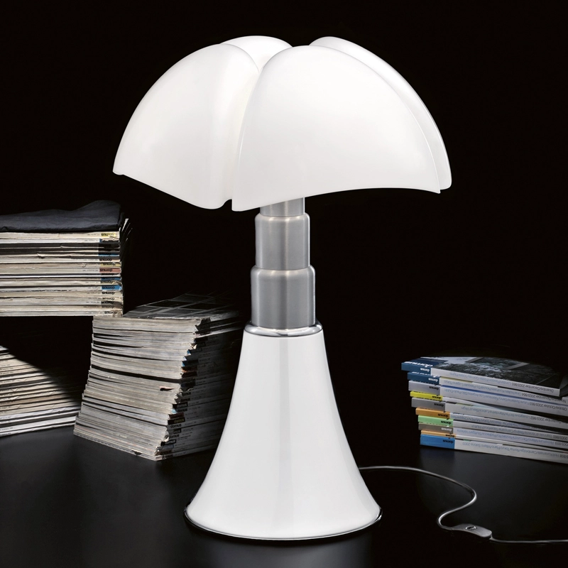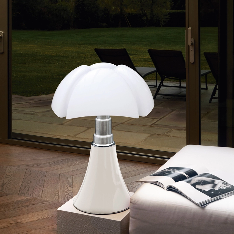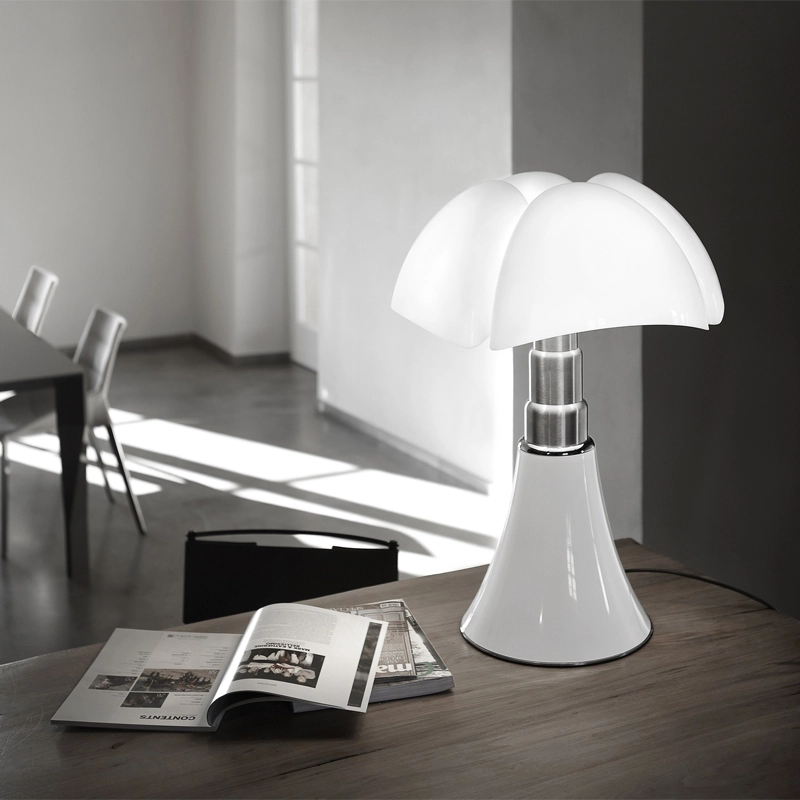 This design classic was designed in 1966 by Gae Aulenti, using techniques that were highly innovative for the time. The queen of Italian design for over 50 years, the Pipistrello Martinelli Luce table lamp features a metal tulip base, telescopic brushed stainless steel arm and opaline white methacrylate diffuser. The Pipistrello Martinelli Luce is a table or floor lamp with diffused light. A telescopic system enables the height to be adjusted between 66cm and 86cm. The base of the lampe Pipistrello Martinelli Luce is made of metal painted in very dark brown or white. The design of the diffuser is inspired by the wings of the pipistrello, the European bat from which it takes its name. The shape of the flared base expands in height, widening at the ribs of the diffuser like the wings of a bat. The diffused light that the Pipistrello Martinelli Luce reflects and the ingenuity of its telescopic arm have helped build the success it enjoys today. Pipistrello Martinelli Luce is a timeless object and has made the rounds of all the world's greatest museums. One copy is still in MoMA's permanent collection.