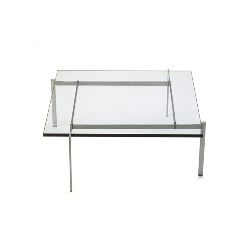 The minimalist PK61A coffee table was created by designer Poul Kjaerholm for Fritz Hansen. This perfectly proportioned table can considered as a designer's manifesto, and highlights Poul Kjaerholm's evolution from industrial designer to furniture designer. The structure provides its unique design, made using four identical components connected by machine screws. Placed simply on the frame, the removable top attests to the designer's trademark principle of using gravity to hold the components in place. The PK61 top is available in glass, granite, and marble to suit all living room styles. The base is made of satin stainless steel.