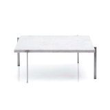 The minimalist PK61A coffee table was created by designer Poul Kjaerholm for Fritz Hansen. This perfectly proportioned table can considered as a designer's manifesto, and highlights Poul Kjaerholm's evolution from industrial designer to furniture designer. The structure provides its unique design, made using four identical components connected by machine screws. Placed simply on the frame, the removable top attests to the designer's trademark principle of using gravity to hold the components in place. The PK61 top is available in glass, granite, and marble to suit all living room styles. The base is made of satin stainless steel.