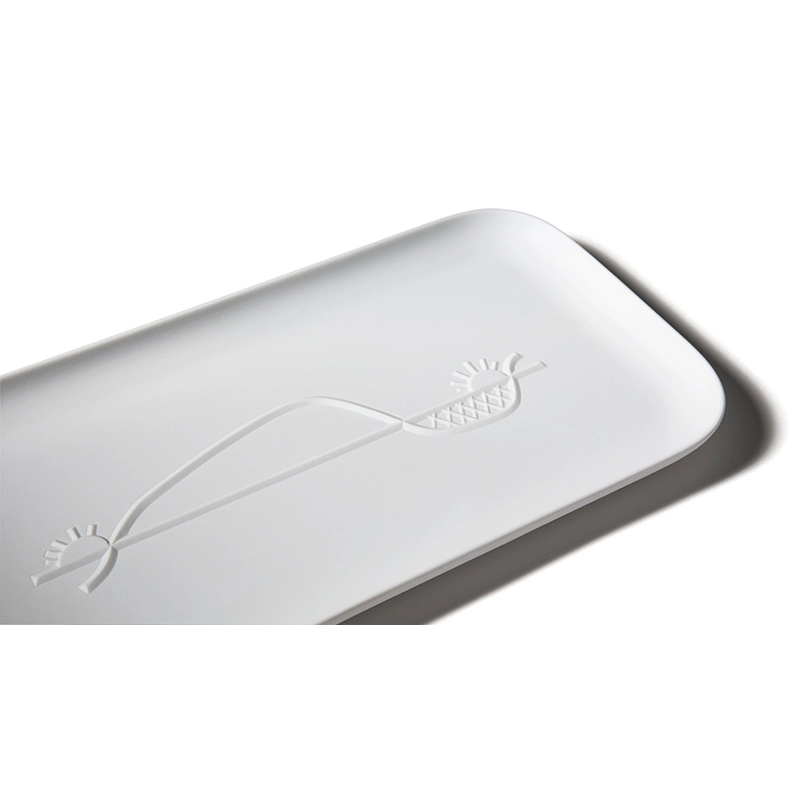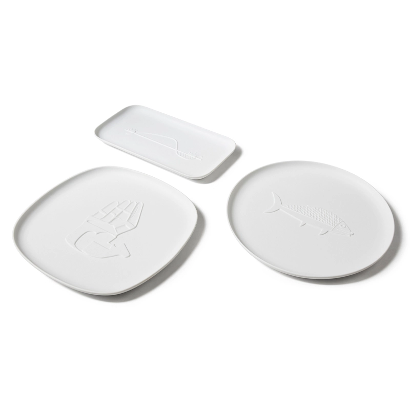 Cassina draws inspiration from the genius of Le Corbusier to create an exclusive collection of three modern trays in pure unglazed porcelain. The Chandigarh tray collection is the result of a collaboration between Cassina and Ginori 1735. Each tray, inspired by symbolic drawings of the city of Chandigarh designed by Le Corbusier, features unique bas-reliefs. These functional art pieces embody subjects traced by the Master in 1956: an open hand symbolising peace on a square tray with rounded corners, a fish on a round tray, and the movement of the sun on a rectangular tray. The Chandigarh porcelain tray collection fuses the architectural inspiration of Le Corbusier with the exceptional craftsmanship of Ginori 1735, offering a refined visual experience and a connection to the legacy of the famous architect.