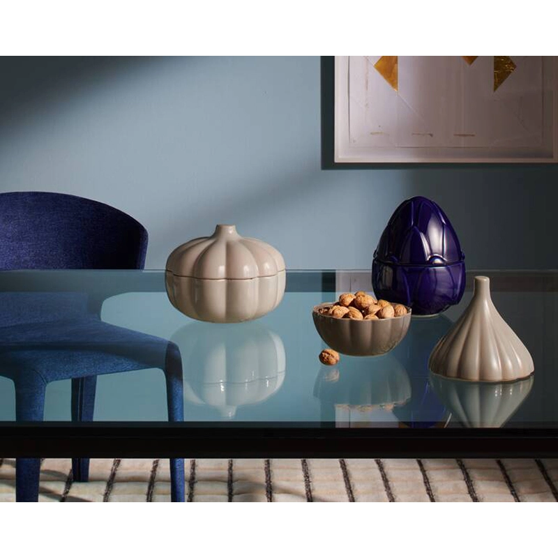 The collection of Taac containers is a creation by chef Davide Oldani for the Cassina brand, offering a metaphorical reinterpretation of the concept of seasonality at the table. This collection consists of four glazed ceramic containers in the shape of a pumpkin, onion, asparagus and chicken, available in three colours. Through sensoriality, Taac containers sublimate the very nature of the ingredients. Each container has a bell-shaped lid, revealing the recipe's main seasonal ingredient.