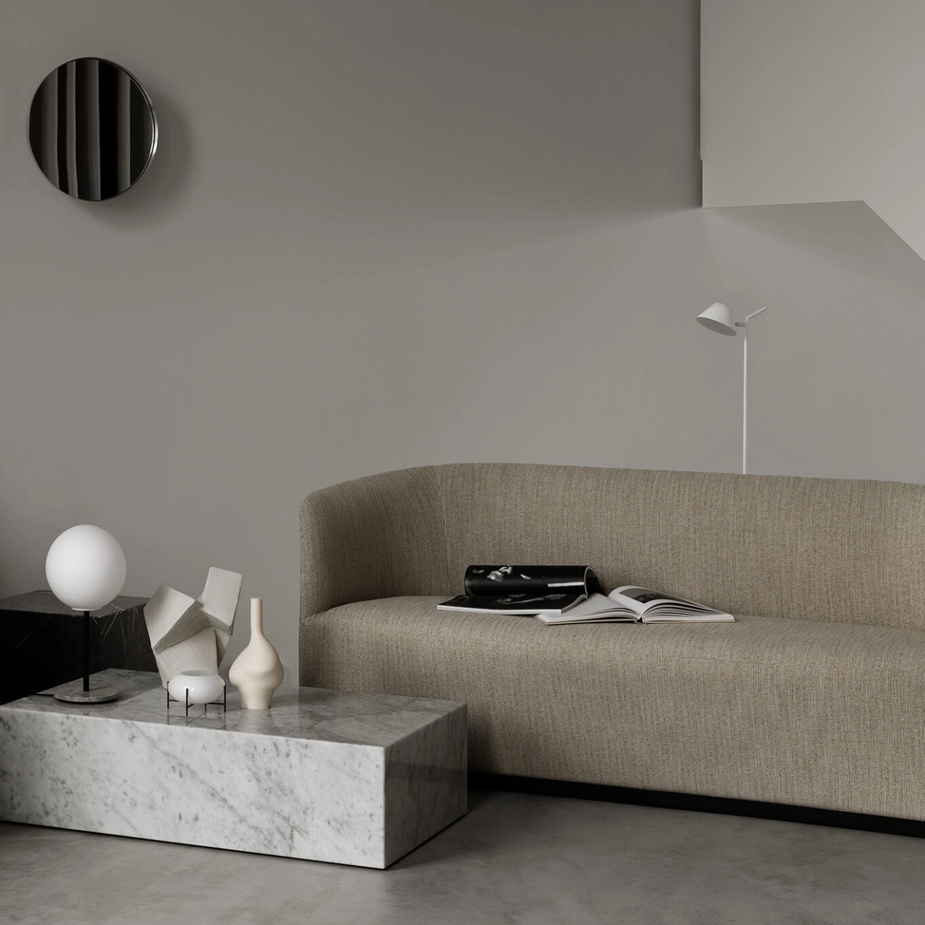 The coffee table PLINTH LOW Marble Carrara elegantly illustrates the sculptural and contemporary vision of Audo Copenhagen, where the purity of volumes dialogue with the nobility of marble. Its top in Carrara marble, with a luminous whiteness punctuated by delicate veining, gives the room a graphic and refined presence, capable of structuring a space with subtlety. Thought to integrate into high-end residential lounges, lounges, hotel lobbies or contemporary reception spaces, it settles with fluidity, alone or in composition, valuing both circulation and decorative staging. Its low proportion offers an ideal surface for arranging books, objects or plant compositions, while maintaining a clear and balanced formal reading. The contrast between the visual lightness of volumes and the expressive density of marble creates a harmonious dialogue with contemporary seating, refined textiles or mineral materials, enhancing the sophisticated atmosphere of the place. Faithful to the PLINTH aesthetic, the design is based on a controlled balance between monumentality and finesse, reflecting a vision where use and formal expression respond with evidence. The PLINTH LOW Marble Carrara coffee table stands out for the purity and elegance of its natural stone, for its architectural writing with a strong identity, for its versatility in refined residential or contract projects, and by its ability to become a timeless anchor at the heart of sophisticated contemporary interiors.