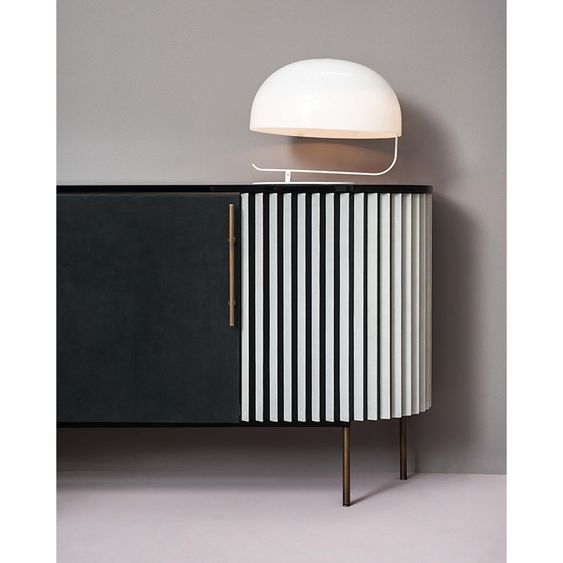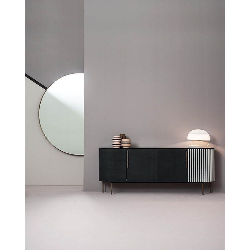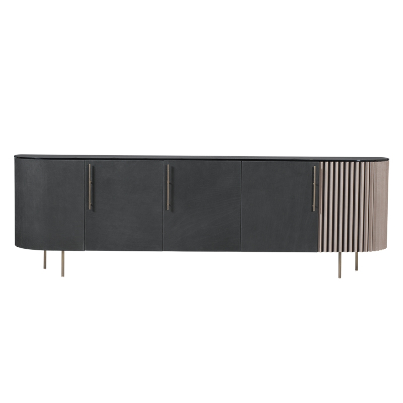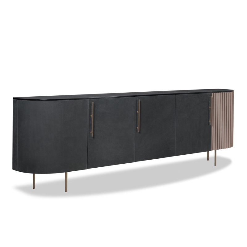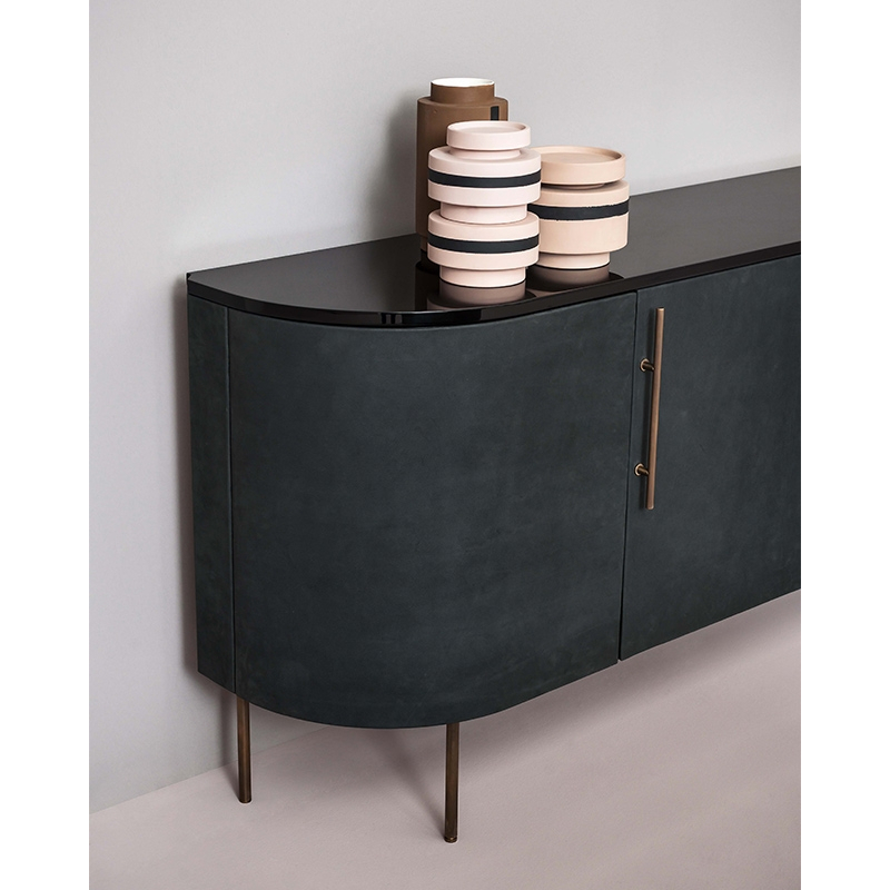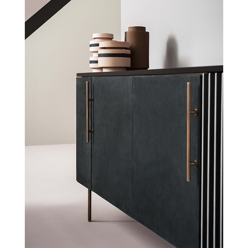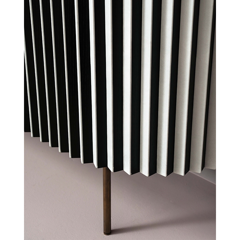 Designed by Draga & Aurel, Plissé combines three pieces of furniture in a single cupboard or cabinet. The outside of the furniture is partly covered with leather, while the other part has a pleated pattern. This relief pattern is made of black-stained oak and leather.With this elegant and meticulous work, the leather here expresses all its strength and makes this piece of furniture unique.The interior is entirely in oak finish and the shelves in glass.Finally, the handles and feet are made of hand-burnished metal with a matt varnish. With its luxurious materials and refined lines, this is an exceptional piece of furniture that will stand out in any interior. Plissé is also available in a wardrobe version.