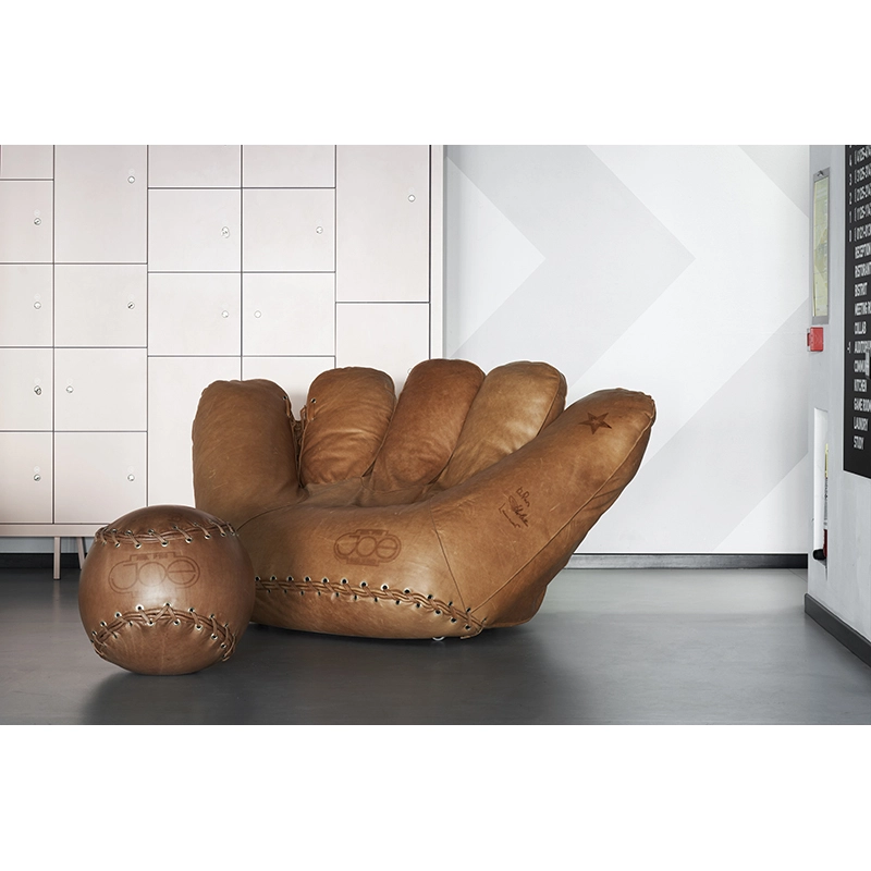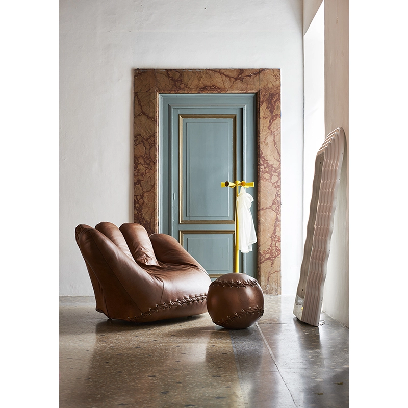 The Joe Ball leather footrest was created to mark the fiftieth anniversary of the famous Joe armchair, designed by Studio De Pas, D'Urbino and Lomazzi and published by Poltronova. The shape and seams typical of Joe Ball are reminiscent of a baseball. The pouf Joe Ball is the natural complement to the Joe armchair.It has a weight inside that makes it stable like a seat. The leather used to create the Joe Ball footrest bears the characteristic marks of Centro Studi Poltronova.