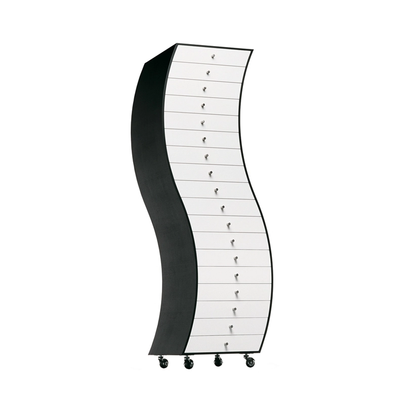 In 1970, Shiro Kuramata designed a collection of chests of drawers of different shapes. The frame is made of black-stained ash and the 49 asymmetrical drawers are in white lacquered fibreboard panels. Each drawer is equipped with a brushed-steel knob. Mounted on casters, these Progetti Compiuti pieces make a statement in a room with their sculptural profiles. These pieces of furniture produced by Cappellini are extremely beautiful in either the bedroom or the living room.