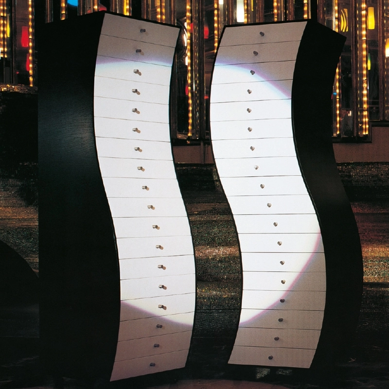 In 1970, Shiro Kuramata designed a collection of chests of drawers of different shapes. The frame is made of black-stained ash and the 49 asymmetrical drawers are in white lacquered fibreboard panels. Each drawer is equipped with a brushed-steel knob. Mounted on casters, these Progetti Compiuti pieces make a statement in a room with their sculptural profiles. These pieces of furniture produced by Cappellini are extremely beautiful in either the bedroom or the living room.