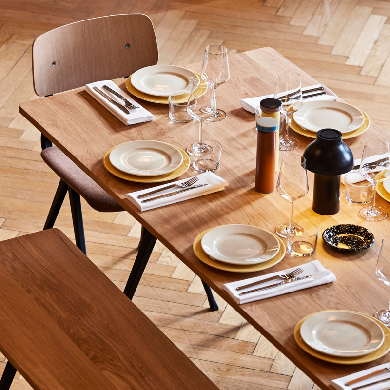 The Pyramid table series is part of the collections relaunched by Ahrend in collaboration with Danish brand Hay. This collection was originally created by Friso Kramer and Wim Rietvield while they were working at Ahrend in the 1950s. Considered an innovative creation, the Pyramid tables are the result of an innovative use of sheet steel on a product with an organic, contemporary shape. Complemented by a slim sheet steel base, the rectangular oak top gives the Pyramid series a functional, uncluttered character. The result of simple construction and the use of durable, solid materials, the Pyramid tables published by Hay lend themselves to a variety of uses.