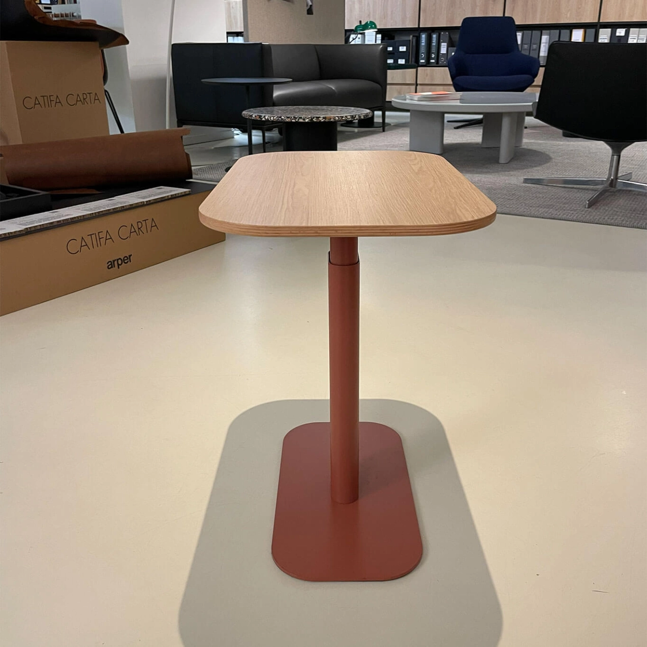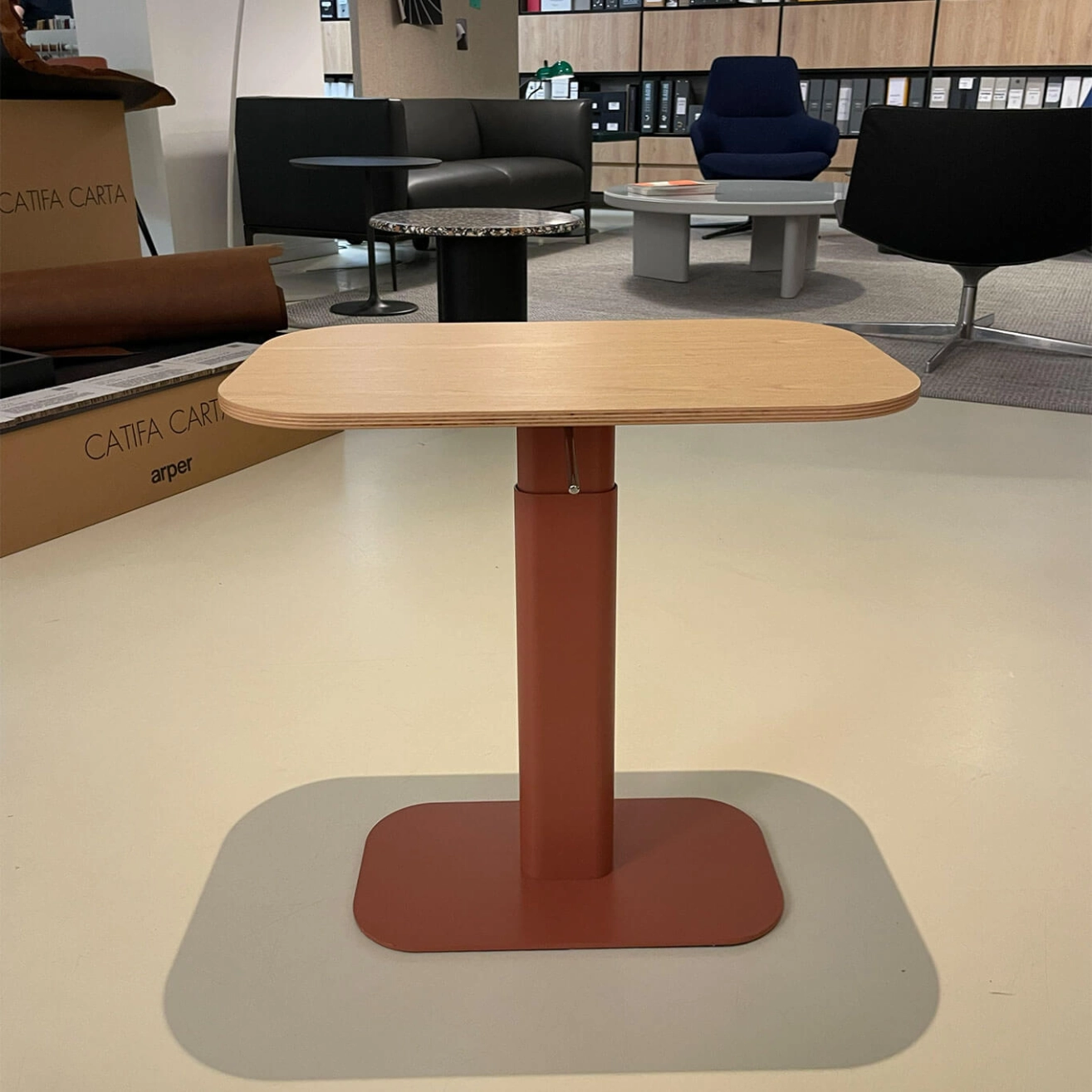 The pre-owned Ralik coffee table, designed by Ichiro Iwasaki in 2023 for Arper, reflects the modular and contemporary spirit of the collection. Both elegant and functional, it integrates seamlessly into residential and professional environments. It features a central base with a painted metal column and incorporates a gas-lift mechanism that allows for smooth and precise height adjustment, adapting easily to different everyday uses. The rectangular plywood top, finished in oak composite veneer and measuring 1.2 cm thick, adds warmth and refinement to the overall design. The finishes of the base and the top can be freely combined, offering great flexibility and aesthetic harmony to suit a wide range of interior settings.