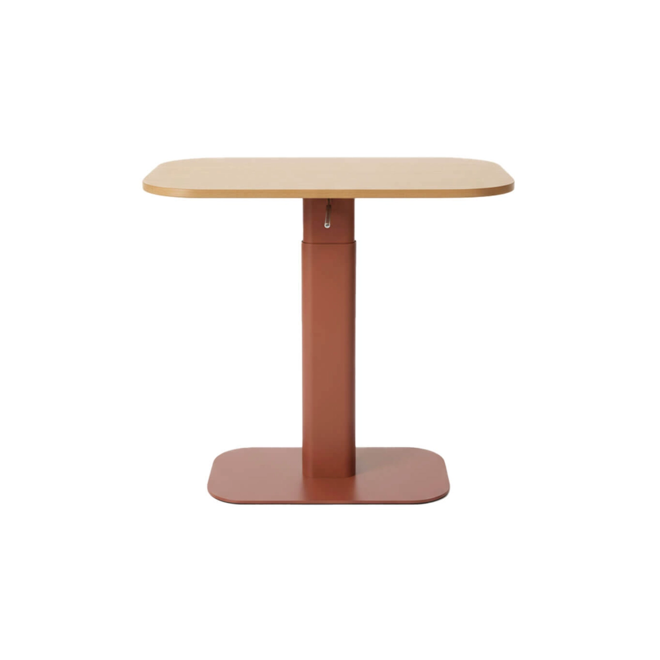 Central base and painted metal column, gas lift mechanism for height adjustment, rectangular plywood top and pre-composite oak finish