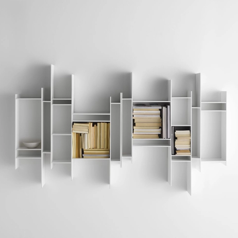 A hanging bookcase created by the Neuland group, Randomito is the baby brother of the well-known Random library, winner of several awards. Made up of shelves in fixed but varying sizes, the irregular shelf positioning turns heads. It houses your books, CDs, and other objects in bedrooms and living rooms, and can also be placed in hallways or corridors thanks to its shallow depth (20cm). Available in several colours, Randomito is made of embossed and lacquered 6mm fibrewood panels, backed with melamine. The components can be juxtaposed to form a long bookshelf.