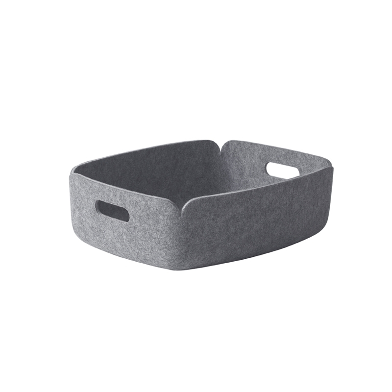 Mika Tolvanen de Muuto's Restore series has been expanded to include the Restore Tray, a small basket that can be used as both storage and a tray. 100% ecological, it is made of felt produced from plastic bottles. Restore's finish lends a certain refinement to the object, which can be used in the living room for magazines or objects that are lying around as well as in an office to store papers.