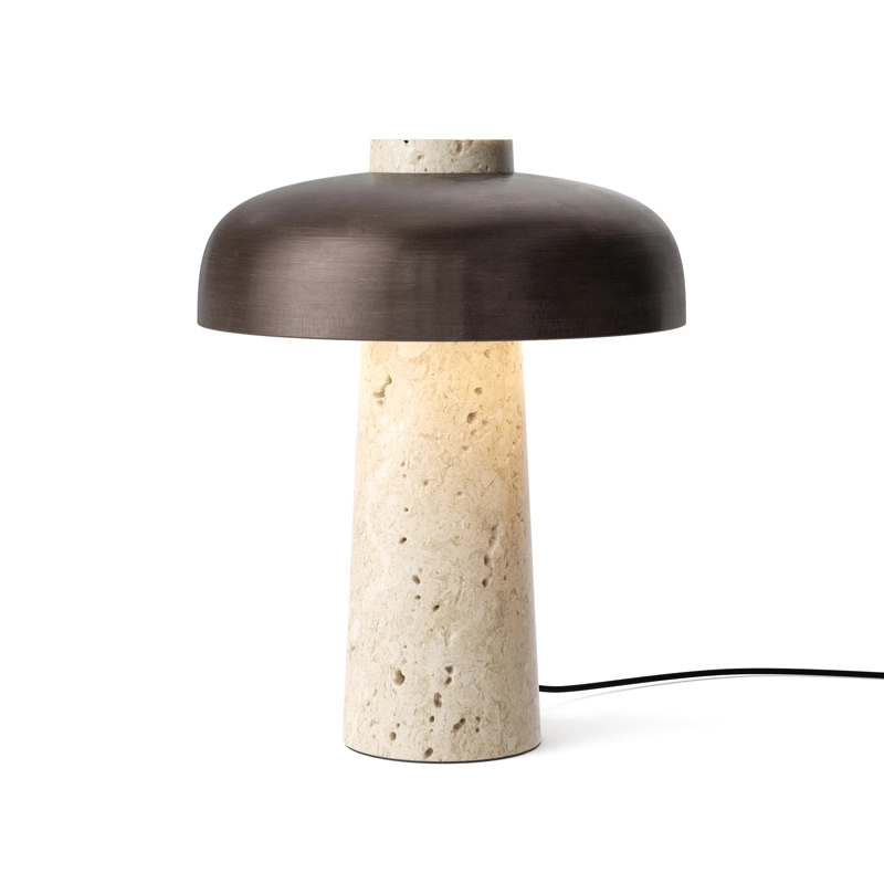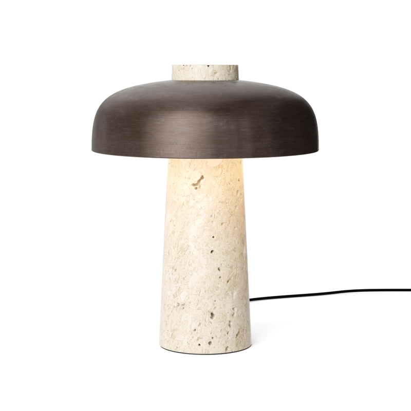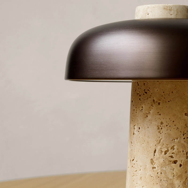 Inspired by the play of structure created by geometric constraints, the tapered travertine base and burnished brass shade of