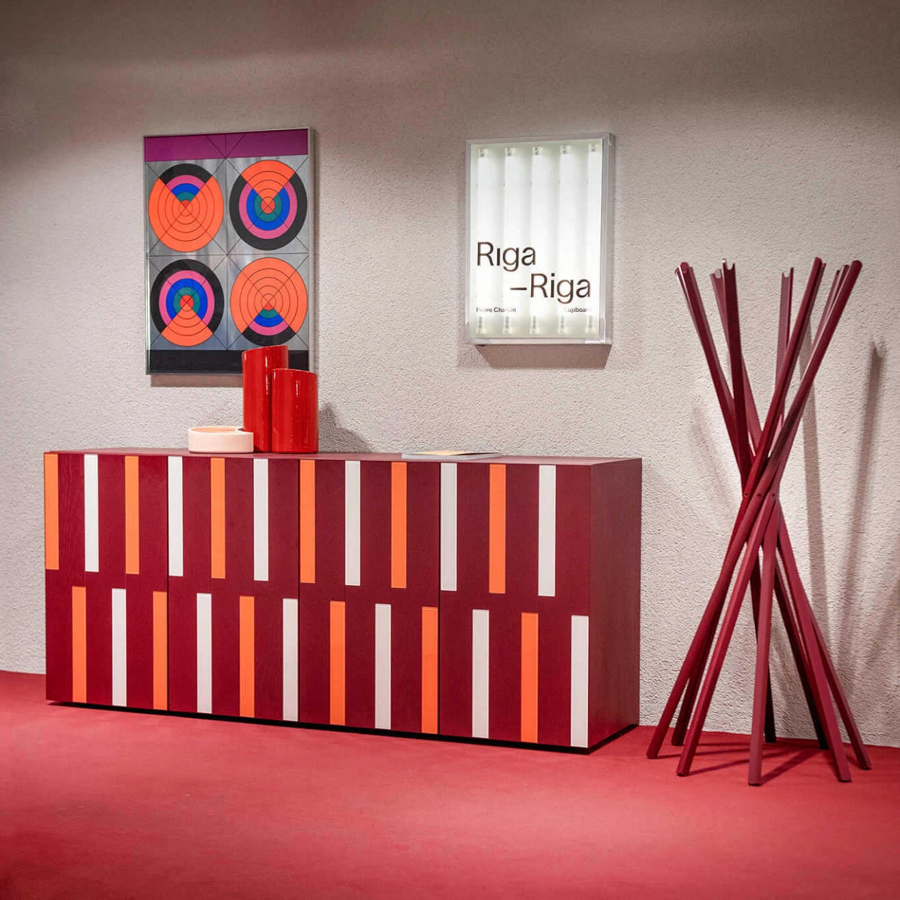 Resulting of a collaboration between French designer and artist Pierre Charpin and Zanotta, Riga-Riga is a collection of sculptural tables and sideboards. The Riga-Riga storage stands out for its inlaid pattern of coloured handcrafted glass. The contrast between the ash wood and the polished coloured glass elements creates rhythm and a three-dimensional appearance, positioning the Riga-Riga collection in an artistic universe.