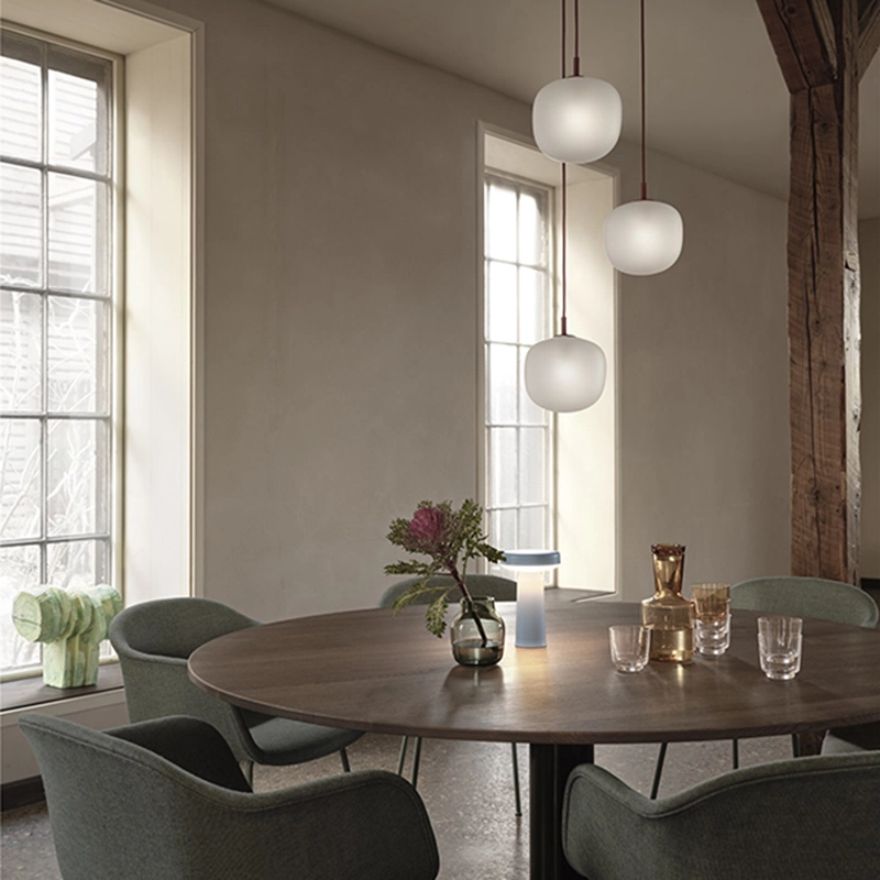 Imagined by Taf Studio for the Muuto brand, the Rime collection brings a contemporary perspective to the traditional glass suspension. The semi-transparent glass diffuser has been sanded, creating a surface with a sophisticated expression and allowing a subtle view of the light source. The design of Rime stands out with a shape full of character that blends into any atmosphere, complemented by an epoxy finish top and matching power cord, adding a modern touch. Thanks to the opacity of the glass, the Rime suspension emits a three-dimensional diffused light into the room it is in. Available in four colours and four sizes, Rime can be hung on its own or in a combination of several elements, mixing sizes and colours to create linear compositions or clusters of highly personal hangings.