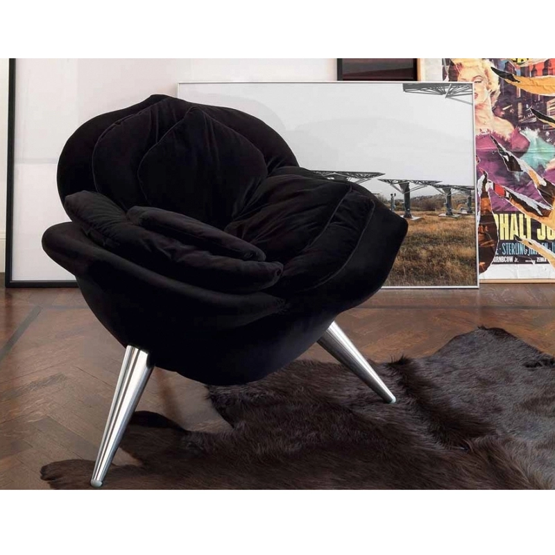 With its rose shape, this armchair, designed by Masanori Umeda, is reminiscent of a haute-couture piece. The petals, which form a very inviting seat, are made separately. The structure is made of moulded metal with small shaped wooden parts. The armchair is padded with polyurethane and synthetic wadding. The legs are made of painted brushed aluminium. The velvet upholstery is available in the colours of the