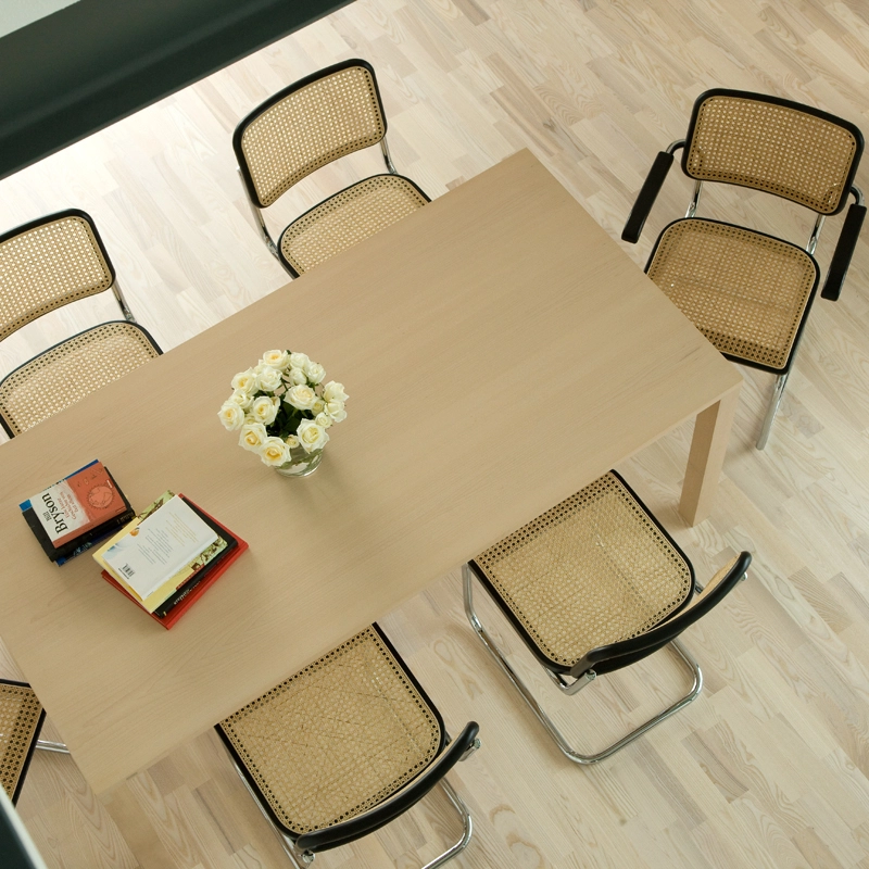 Published by Thonet, the cantilever chair S 32 is the most universal of tubular steel furniture. Navigating easily between the different styles of decoration, it fits perfectly in a resolutely modern room as well as in a space where different styles and eras meet. The S 32 cantilever chair and the S 64 variant with armrests are undoubtedly the best-known tubular steel classics. Their popularity stems from the successful combination of new and old with, on the one hand, the tradition of Thonet as a manufacturer of bentwood furniture upholstered in typical Viennese cane, and on the other, the revolutionary use of tubular steel. The backrest and seat in solid wood and cane embody tradition, the legs symbolise the present and the future. Marcel Breuer designed the S 32 and S 64 models in 1928, during his years in Berlin. Thonet has been producing these two models since 1930. Thanks to their aesthetic reduction, the clarity of their shapes and the lightness of the cane, the seats S 32 and S 64 are suitable for all types of environment, such as conference rooms, waiting rooms, restaurants and private interiors.