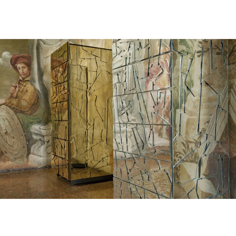Scrigno is a collection of precious storage units in different sizes, high or low, with doors or drawers. The internal structure is made of wood lacquered with special metallic paints that match the colour of the external coating. The outer surfaces are made of laser-cut pieces of methacrylate mirror, assembled by hand. Thanks to this manual production, each piece of furniture is unique. With its sculptural look,
