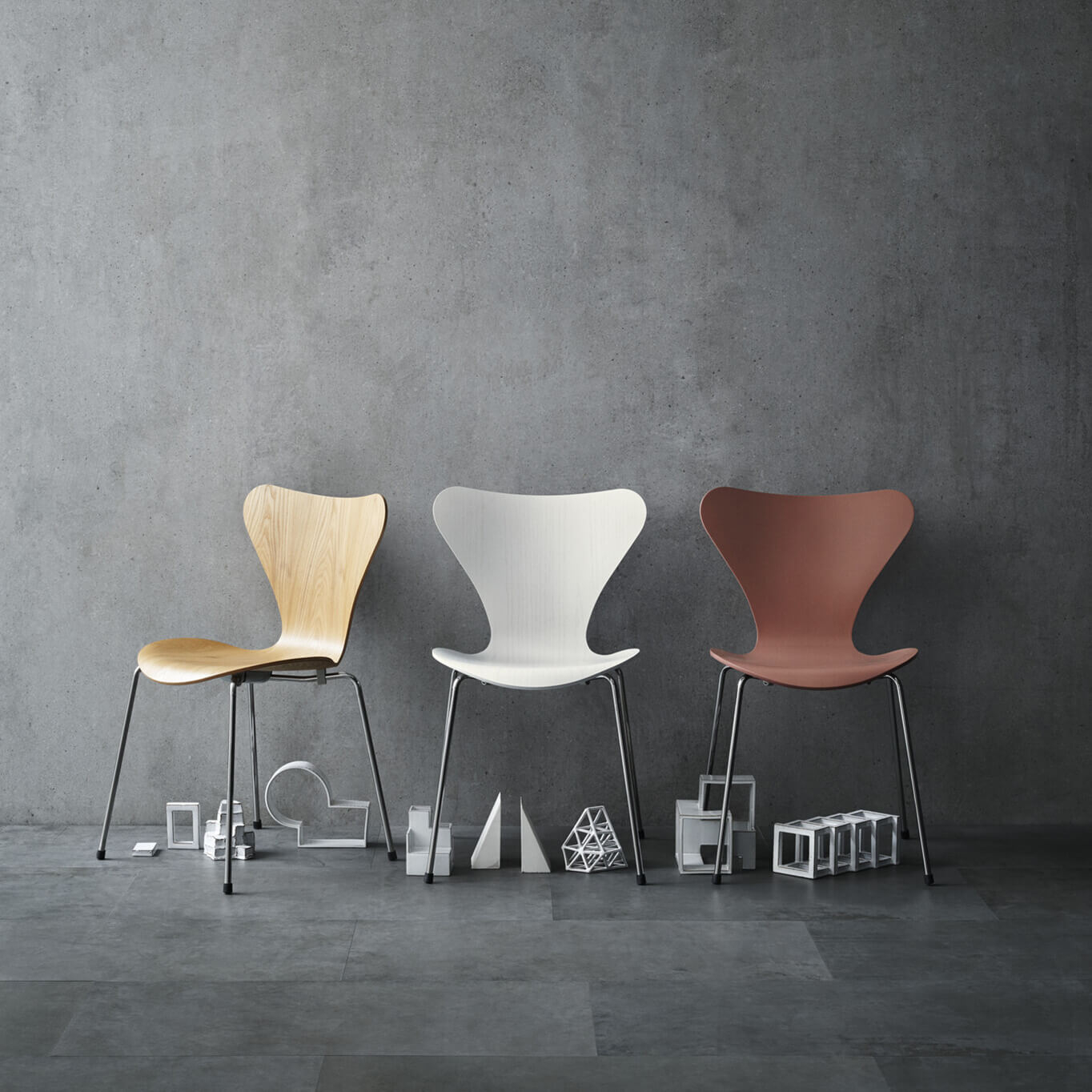 The Series 7 chairs, designed by Arne Jacobsen in 1955, are by far the best-selling chairs in the history of the manufacturer Fritz Hansen. Classics of design, they are part of our daily lives. A visionary, Arne Jacobsen exploited the possibilities of veneer and wood moulding already, used on the Ant Chair in 1952, to achieve the iconic shape of Series 7. Lightweight and stackable, its soft and comfortable shape make it a prized addition in any space. The chrome frame is combined with a natural wood or stained ash seat.
