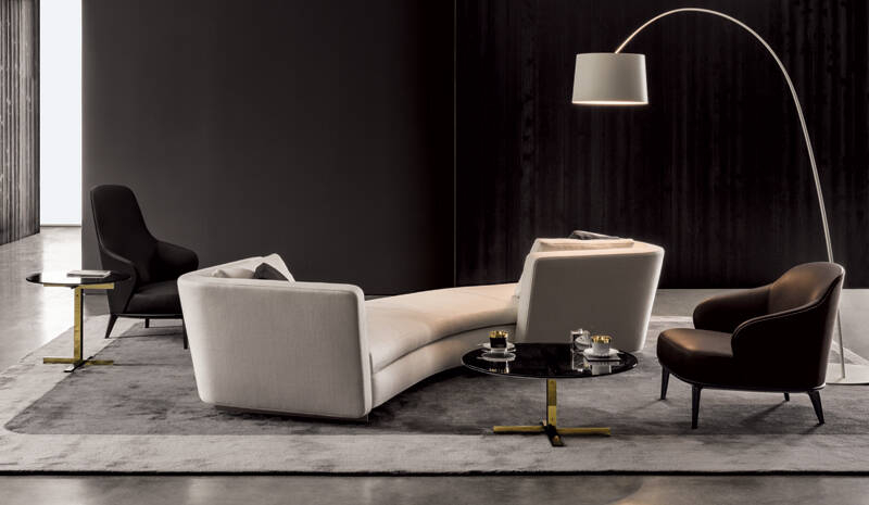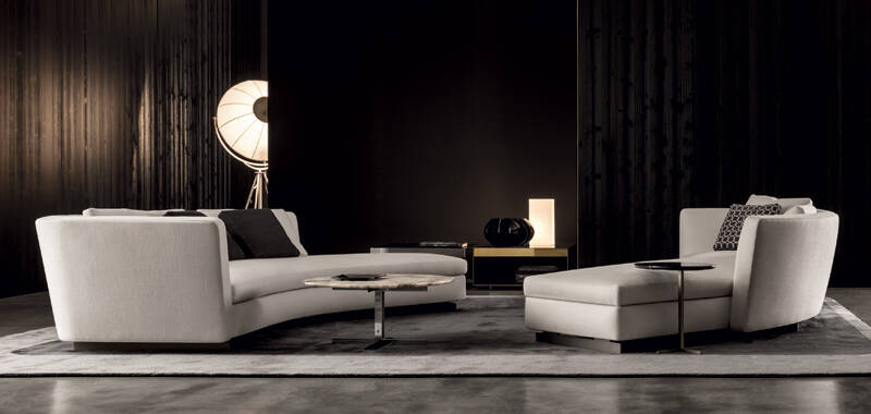 Minotti, rests on elegant bronze-painted aluminium longitudinal bars that lighten the volumes while lifting them off the ground.