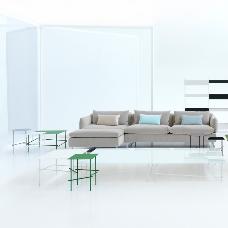 The Shanghai Tip collection of coffee tables is designed by Patricia Urquiola for Moroso. The legs made of lacquered tubular steel echo the coloured wooden sticks used in a game of Mikado. The tray is made of aluminium sheeting. The Shanghai Tip coffee table is available in several sizes and colours (red, green, black, white, and purple). Lightweight and resistant, they are sure to bring a pop of colour to your living room.