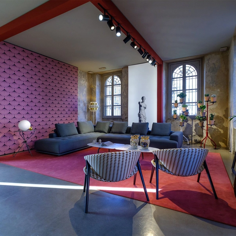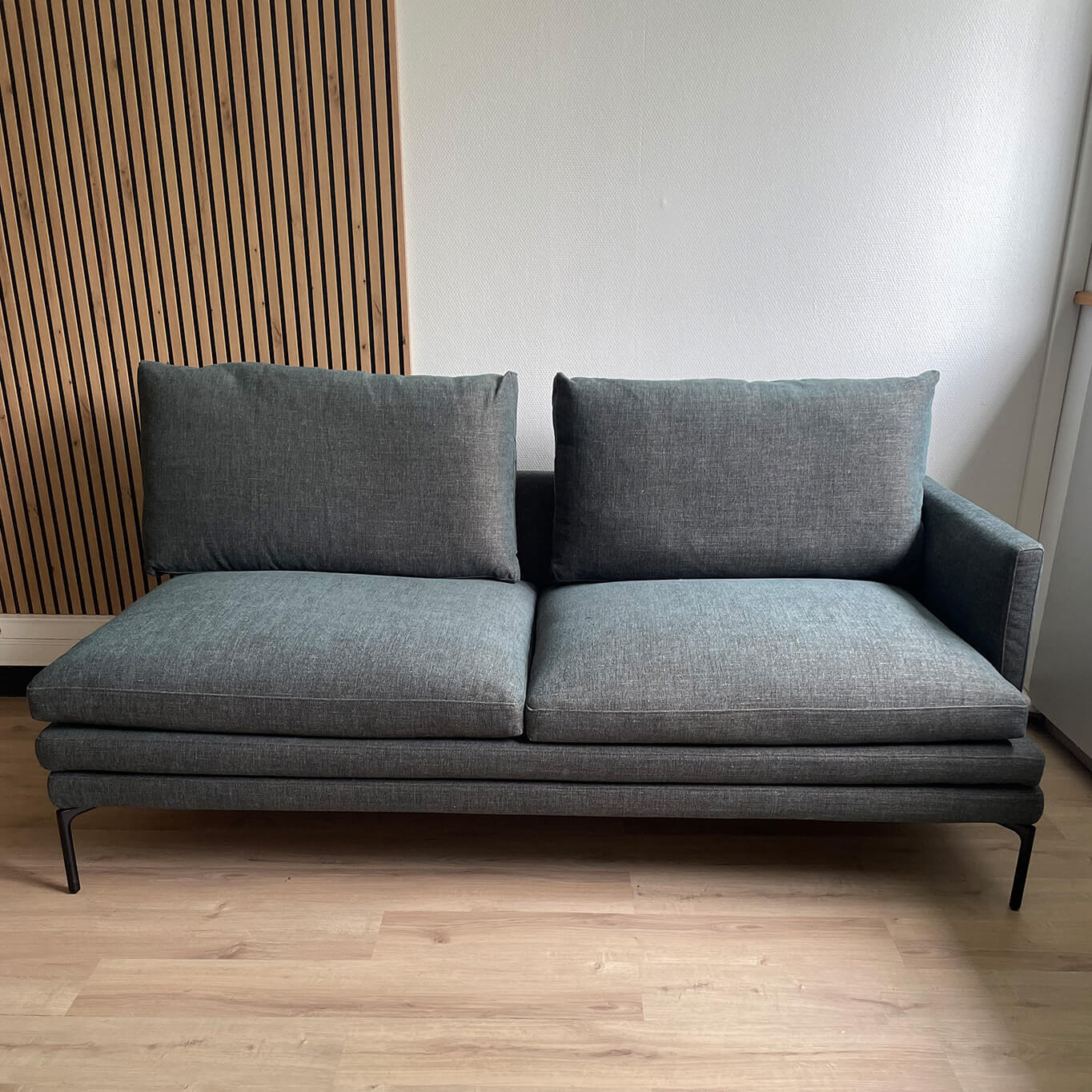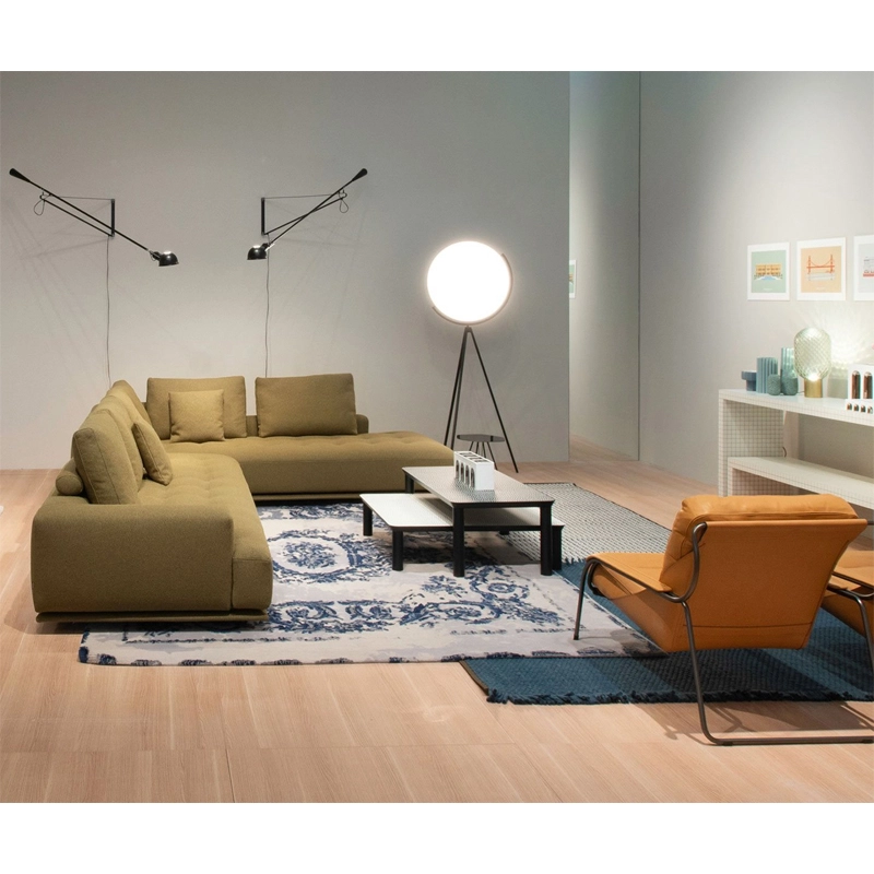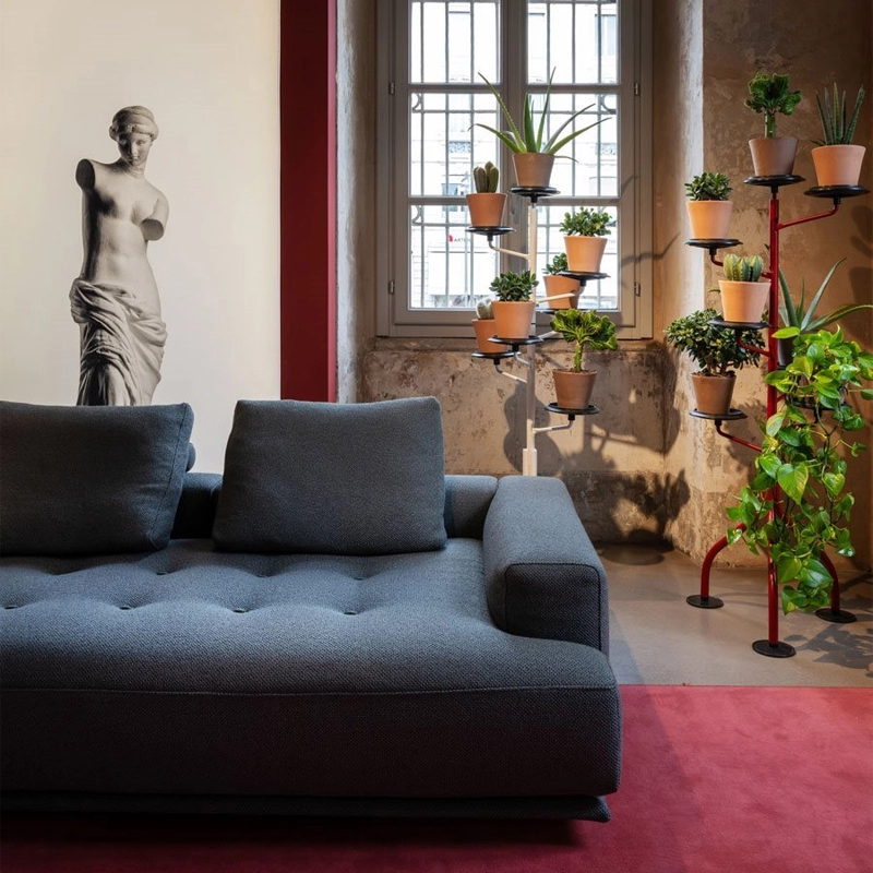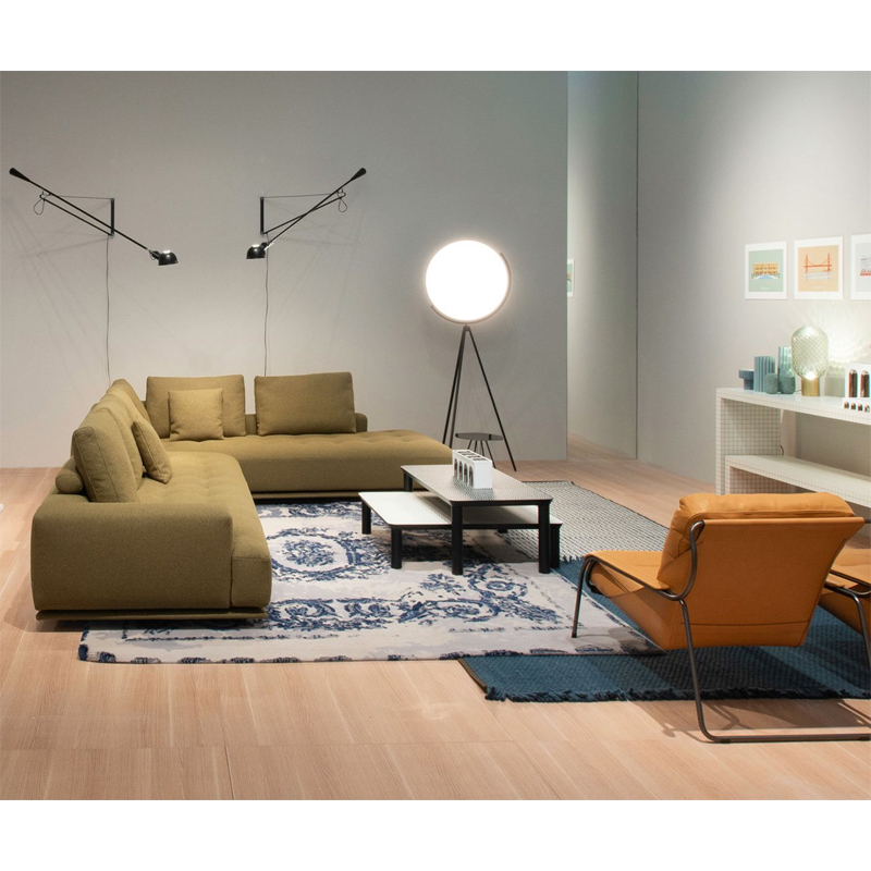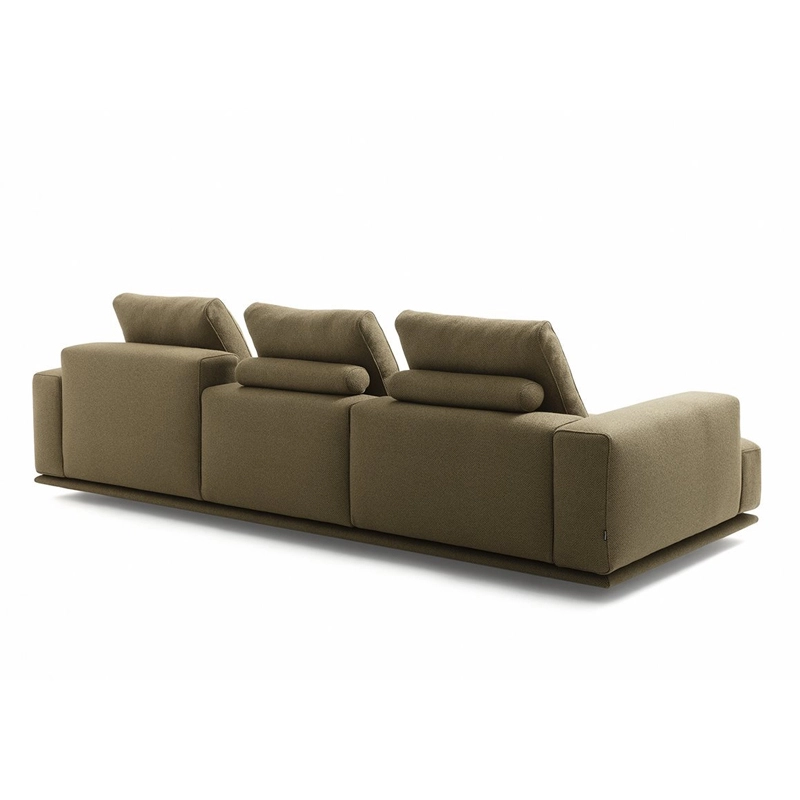 Zanotta. Inspired by the understated traditional Japanese futon, this sofa evokes a thick mattress resting on a wooden base covered with fabric. The quilted pattern delimits the generous seat cushion, embellished by hand-stitching in the shades of the upholstery. The design is characterised by the dynamic alternation of different thicknesses and heights, imitating an urban landscape, an architectural composition created from harmoniously contrasting materials, finishes and volumes. Available in a range of leathers and fabrics, the