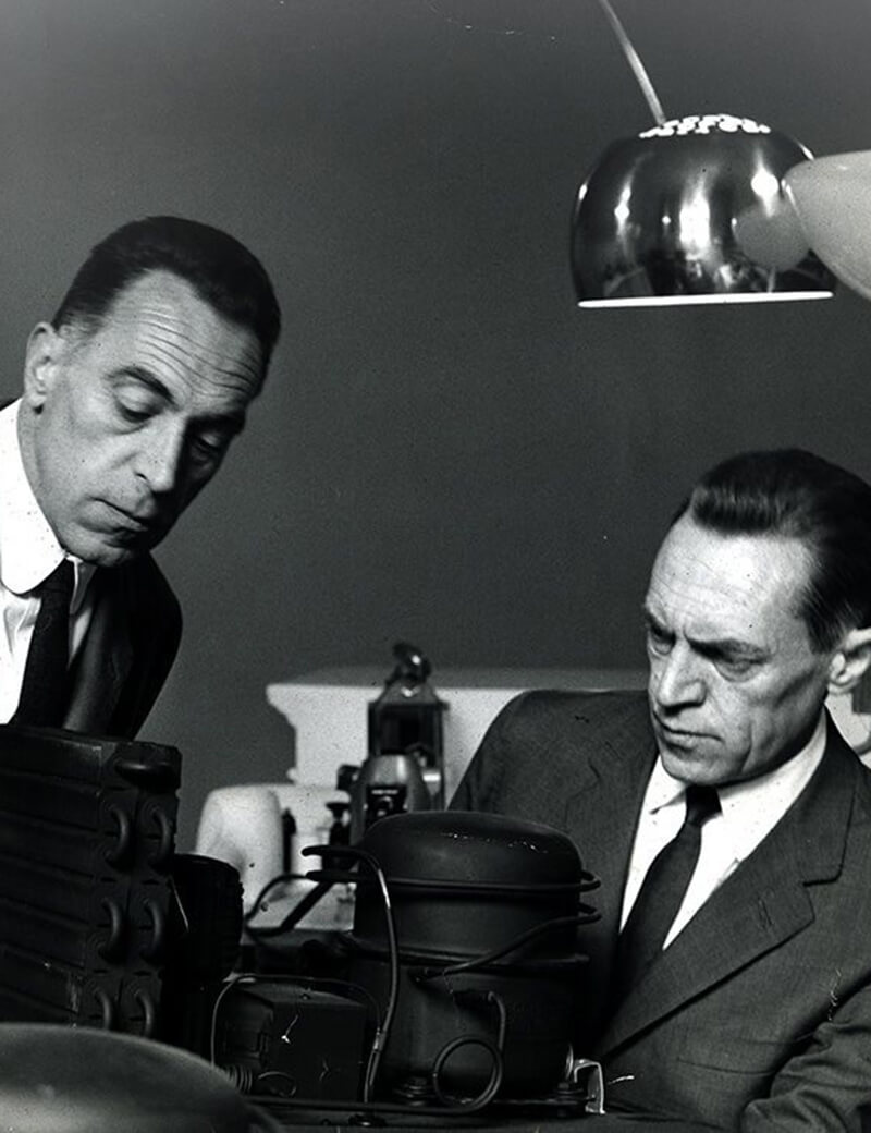 Italian designers and brothers Pier Giacomo and Achille Castiglioni both studied architecture at Milan Polytechnic. The first graduated in 1937, and Achille, the last of the family, also graduated in 1944. He then joined his two older brothers in their design studio in Milan and, together, they developed design projects for Italian companies looking to revive their country's post-war economy. Their work stands out for its particular conception of products through a logical analysis of the functions that the object must fulfil and the means to achieve this. The design, which is very pure, comes next to enable the object to perform its functions. Between 1950 and 1960, the Castiglioni brothers designed a number of products for major brands such as Flos, which produced the Arco floor lamp, a design classic, and Zanotta, for which they created the famous Mezzadro stool with a tractor saddle. The death of Pier Giacomo in 1968 put an end to the collaborations. After the death of his brother, Achille continued to design but devoted most of his time to teaching design, first in Turin and then in Milan.