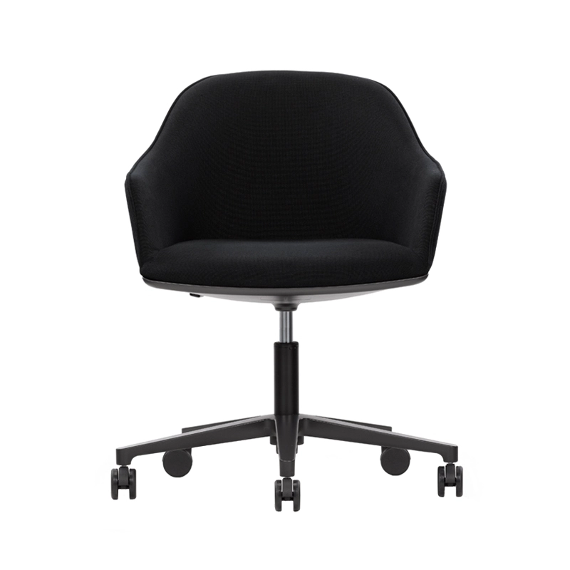 The Softshell armchair designed by Ronan & Erwan Bouroullec for Vitra is an elegant and versatile chair. It is very comfortable and can be used in a conference room or an office. Its soft, enveloping lines and generous, supple padding create both excellent levels of comfort and a sleek, appealing design. The chair has a base with wheels and an upholstered shell covered with Plano fabric. The vertical slats in the shell, which are hidden under the upholstery, adapt to the shape of the user to ensure optimum seating comfort even over long periods of time.Softshell evokes both conviviality and serenity, allowing it to be used in private and collective spaces.