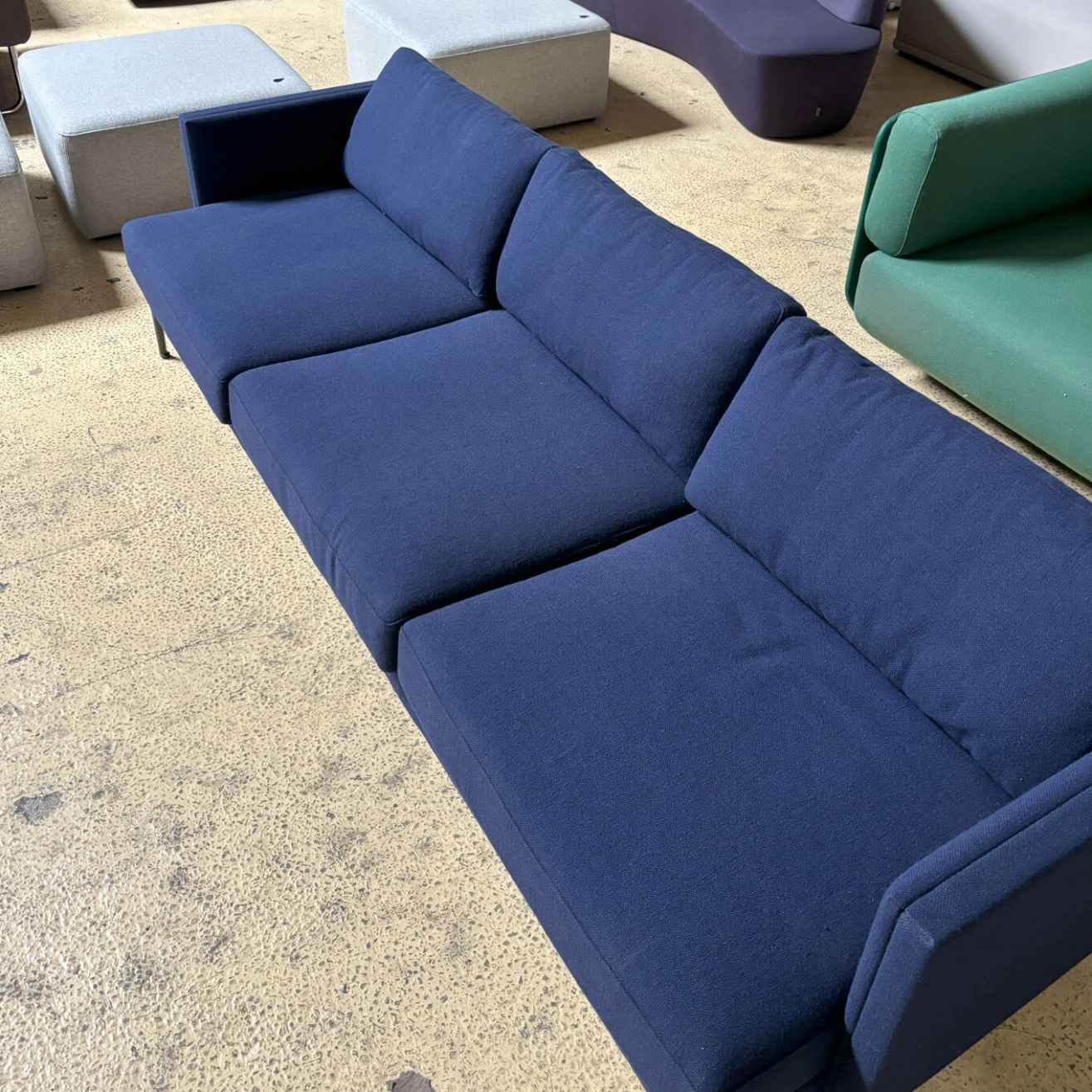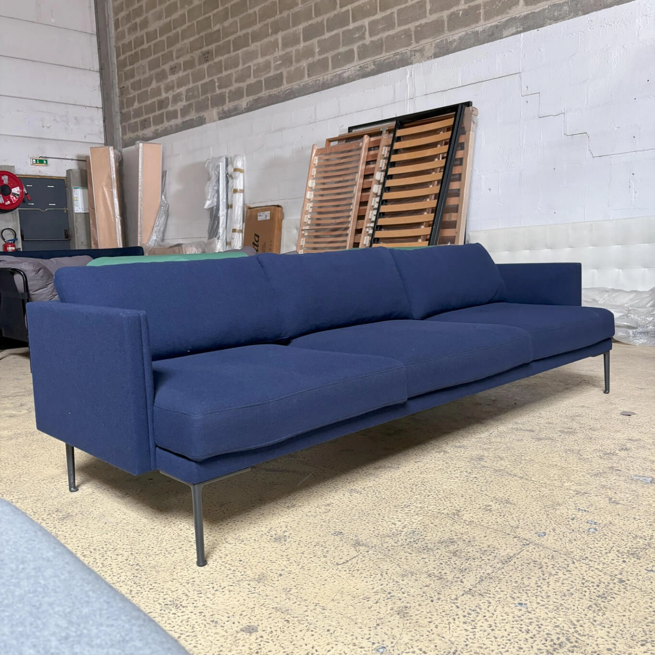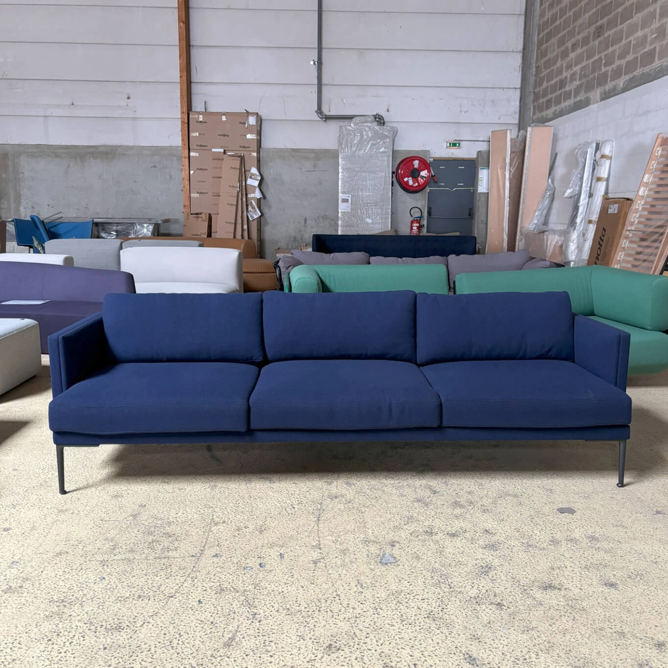 The pre-owned Steeve sofa, designed by French designer Jean-Marie Massaud for Arper, embodies a refined and understated aesthetic. Conceived as a modular system, it offers great freedom of composition thanks to its various elements — benches, armchairs, corner units, and 2- or 3-seater sofas — allowing the configuration to adapt to any type of space, whether private or professional. Its architectural silhouette, with clean and balanced lines, stands out for the absence of visible seams on the armrests and backrests, enhancing the visual unity and purity of the design. Built on an internal steel structure with elastic webbing for optimal comfort, the pre-owned Steeve sofa features high-density foam padding and removable cushions, providing generous and long-lasting support. The exterior is fully upholstered in fabric. The discreet, slender aluminum or steel base enhances the sense of lightness. Available in a wide range of fabrics and colors, it lends itself to multiple customizations, with monochrome or two-tone versions. In line with eco-design principles, it is fully demountable for easy recycling and maintenance, and it holds GREENGUARD Gold certification for low emissions. Combining comfort, modularity, and minimalist elegance, the pre-owned Steeve sofa by Arper stands out as a contemporary piece designed to last, perfectly suited to both residential interiors and demanding professional environments.
