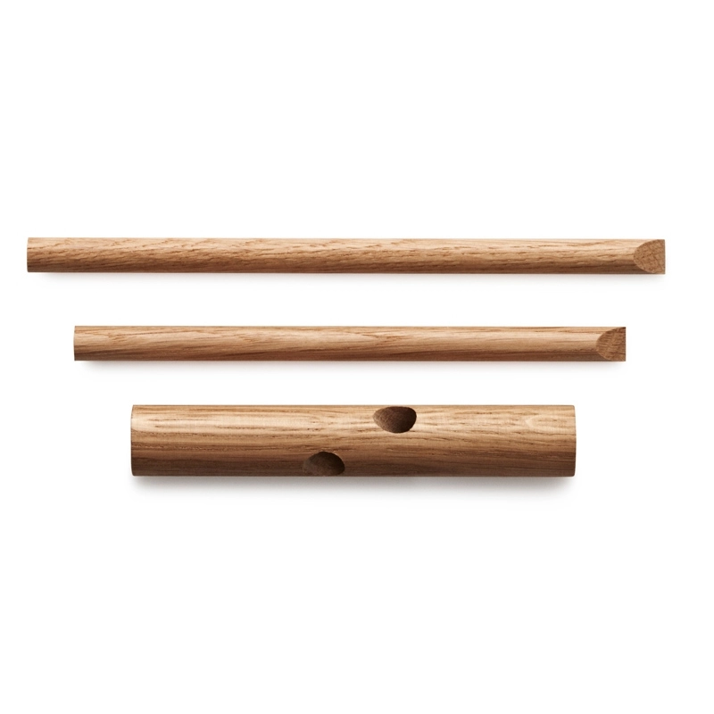 Sticks is a set of two wooden hooks designed by Belgian designer Benoît Deneufbourg and produced by Normann Copenhagen. A simple construction made of three sticks, this original coat rack, which is both practical and decorative, provides various options for hanging your clothes. The clean lines of the Sticks hook clearly reference architecture. Benoît Deneufbourg is fascinated by the triangular structure of roofs – the beams that, when they cross each other, form angles, shapes and space – and this is precisely what inspired the designer when he created Sticks. Discreet and practical, the Sticks hooks (sold in pairs) can be hung anywhere: in the entrance hall, in the kitchen to hang tea towels, or in the bedroom.