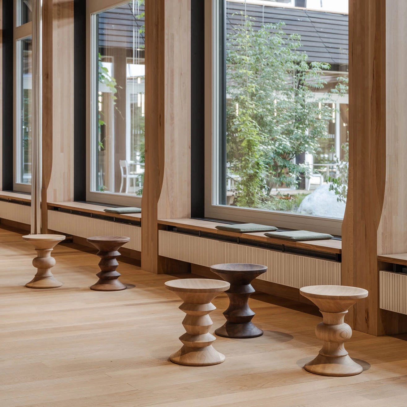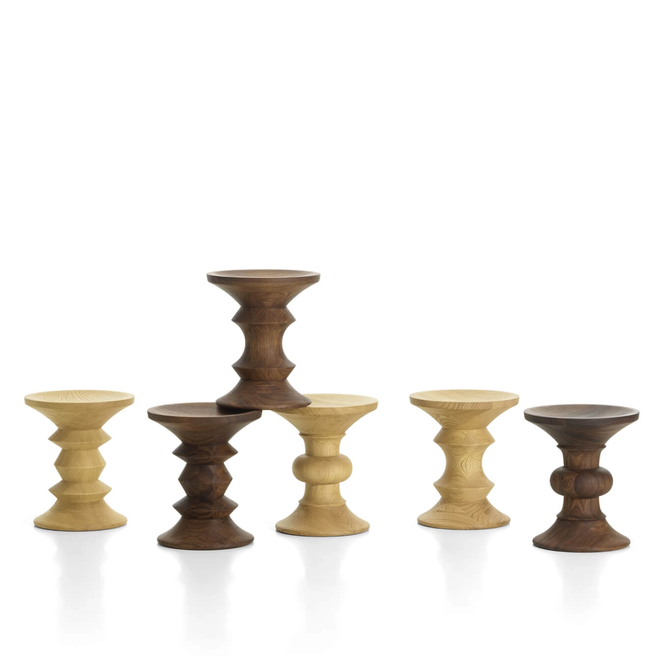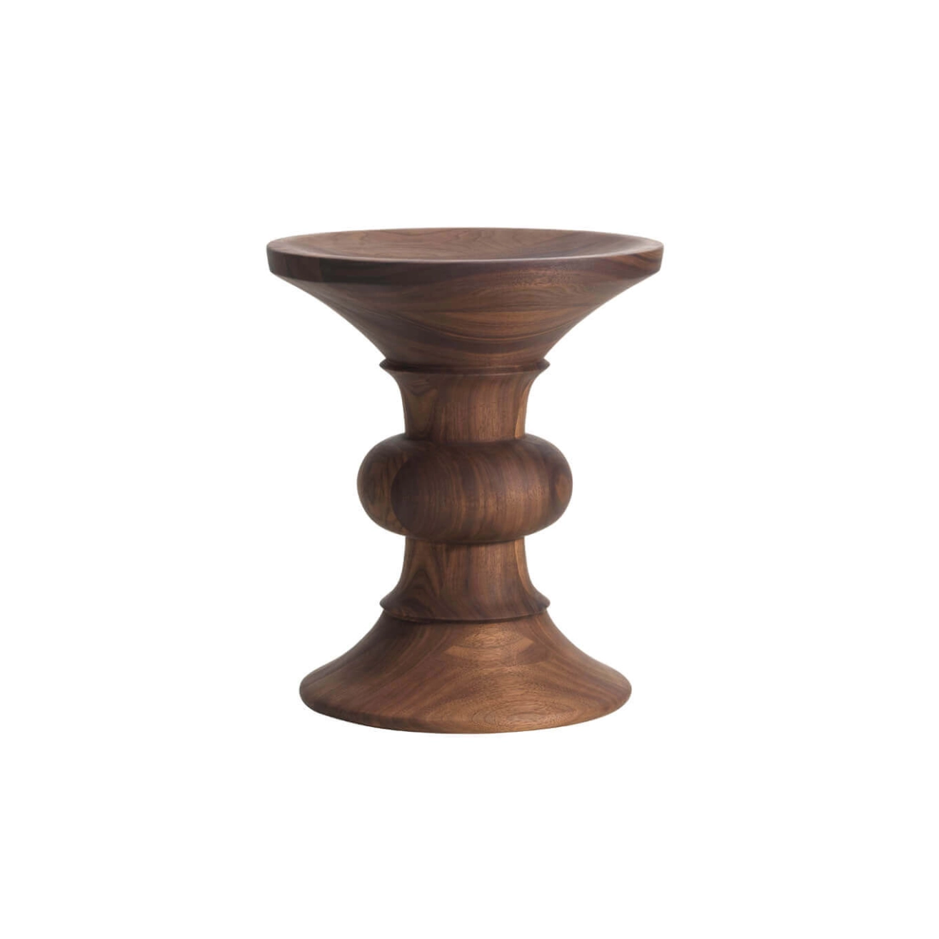 Created in 1960 by Charles and Ray Eames for the development of the halls of the Rockefeller Center in New York, the models A, B and C stools perfectly embody the spirit of American modernist design. Originally designed for the company Time Inc., they reflect the sculptural know-how and balance research specific to the Eames Office. Their slightly concave seat has been designed to offer a comfortable position while allowing to place a cup of tea without it tipping over a subtle alliance between aesthetics and functionality. The models A, B and C are distinguished by their unique rotated shapes, a true play of proportions between curves and geometric lines. Made in chestnut or walnut, these stools reveal all the natural richness of solid wood and the precision of craftsmanship. Versatile, the stools can be used both as a booster seat and as a coffee table. Sculptural, timeless and refined, they bring a warm presence to any space, from the contemporary living room to the design reception hall.