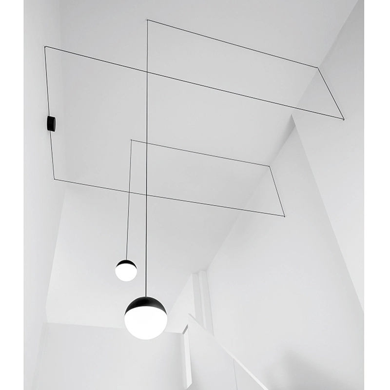 With String Light, Michael Anastassiades has created a suspension light with minimalist lines. Available in cone or ball shape, the light consists of a black painted die-cast aluminium body and a polycarbonate diffuser. It is equipped with a 12-metre Kevlar-reinforced cable, which is an integral part of the light. Indeed, thanks to a set of five hooks, the cable creates geometric lines and thus totally personalises your light and your room. Alone or in a composition of several elements, String creates a new space and brings an architectural touch. A floor switch and a ceiling or wall rose can be ordered separately.