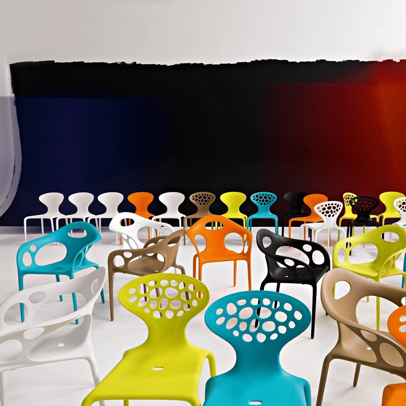 Designed by designer Ross Lovegrove, Supernatural chair uses injection moulding technology in fibreglass-reinforced polypropylene. Echoing the liquid and organic forms cherished by this designer, the shape of the Supernatural chair is achieved via digital data. Designed for both indoor and outdoor use, Supernatural is stackable and available in a variety of colours. The perforated backrest accentuates the visual lightness of this chair produced by Moroso, and creates an array of light and shadows as the light passes through it.