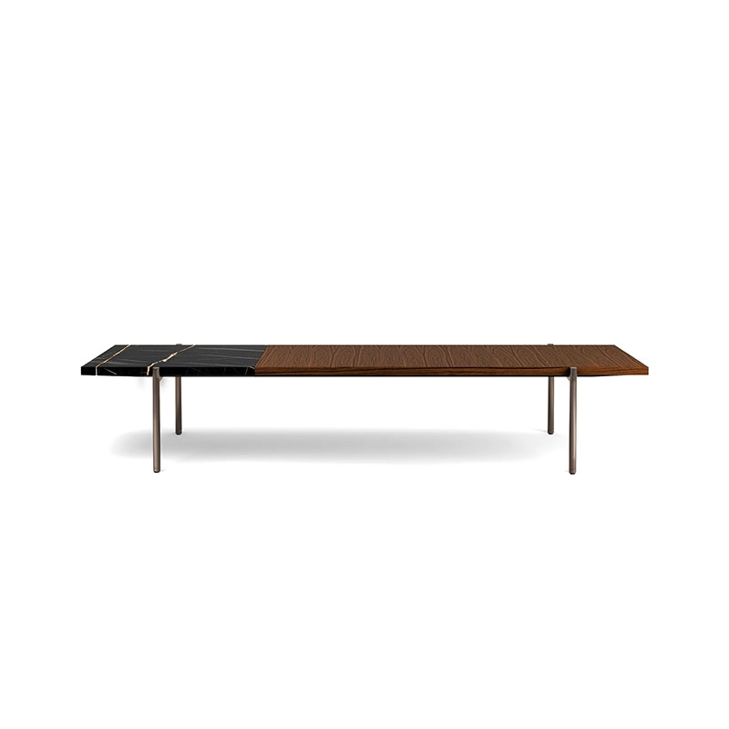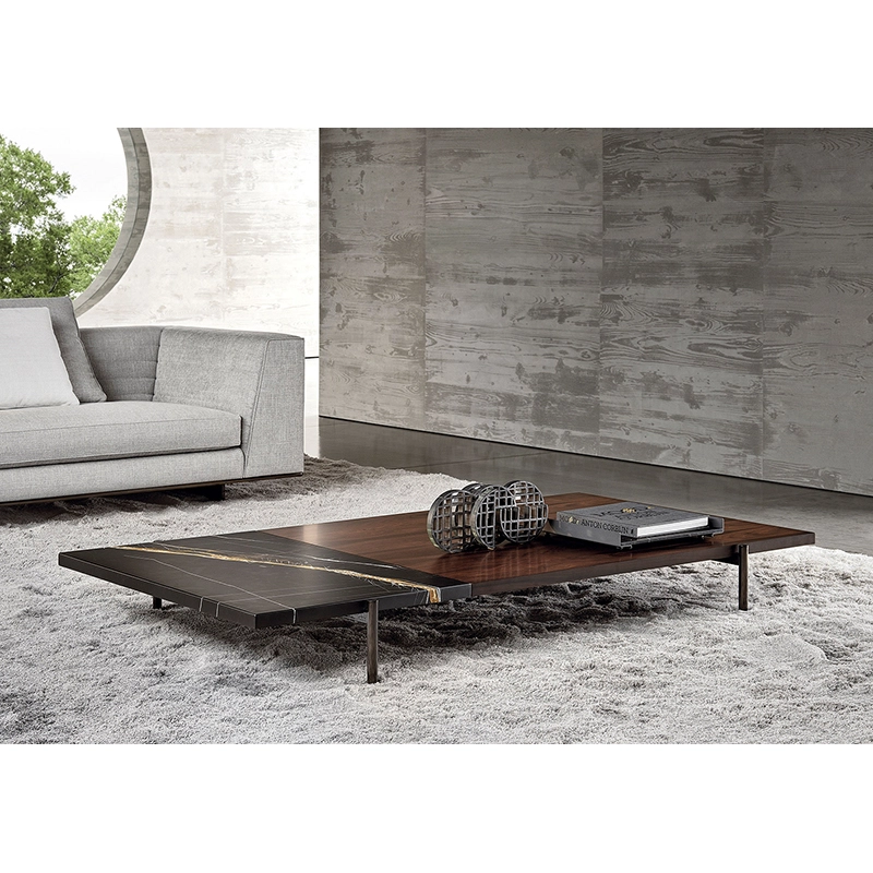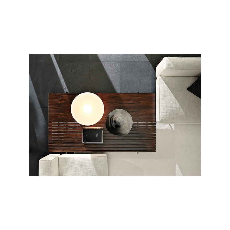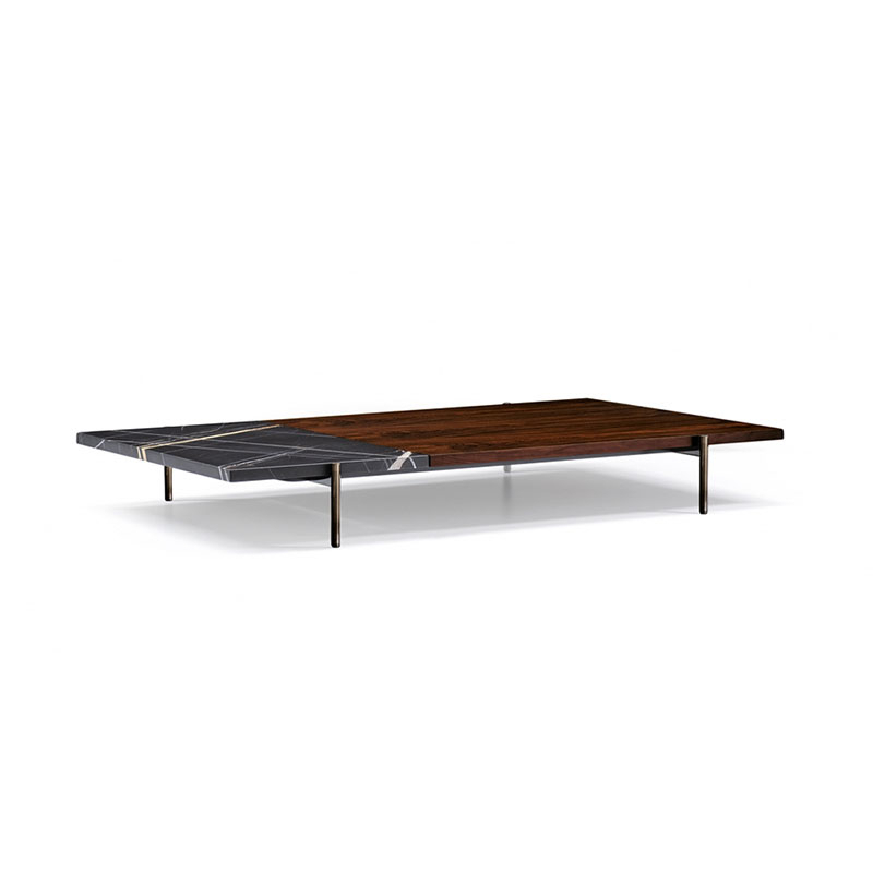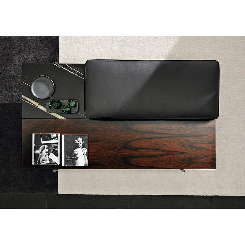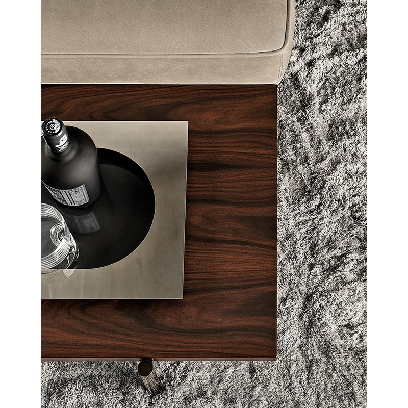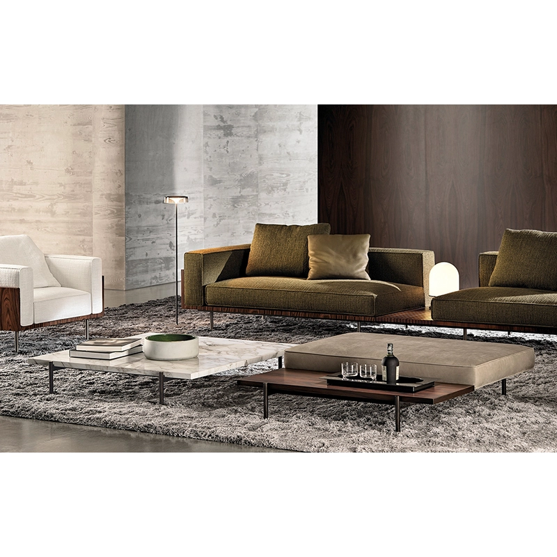 Les tables basses de Minotti Superquadra peuvent être agrémentées soit d’un plateau en marbre Calacatta ou Sahara Noir peint polyester mat -tous deux obtenus à partir d’une technique de pliage - soit en palissandre Santos teinté Dark Brown laqué polyester mat à dalle unique ou avec plateau en lattes de noyer Canaletto teinté Dark Brown.