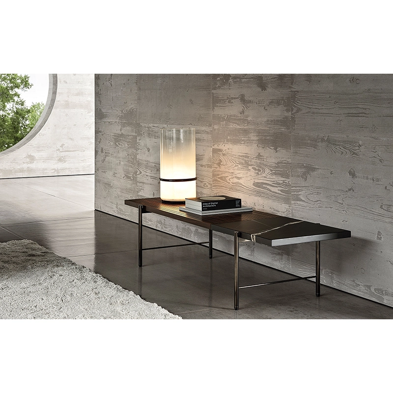 Le volume éthéré de la table Superquadra se reflète dans les lignes graphiques essentielles de la série de petites tables, banquette et consoles du même nom. Les éléments reposent sur une base aux pieds en saillie réalisés en aluminium peint Brandy brillant qui confère aux produits une grande légèreté esthétique.
