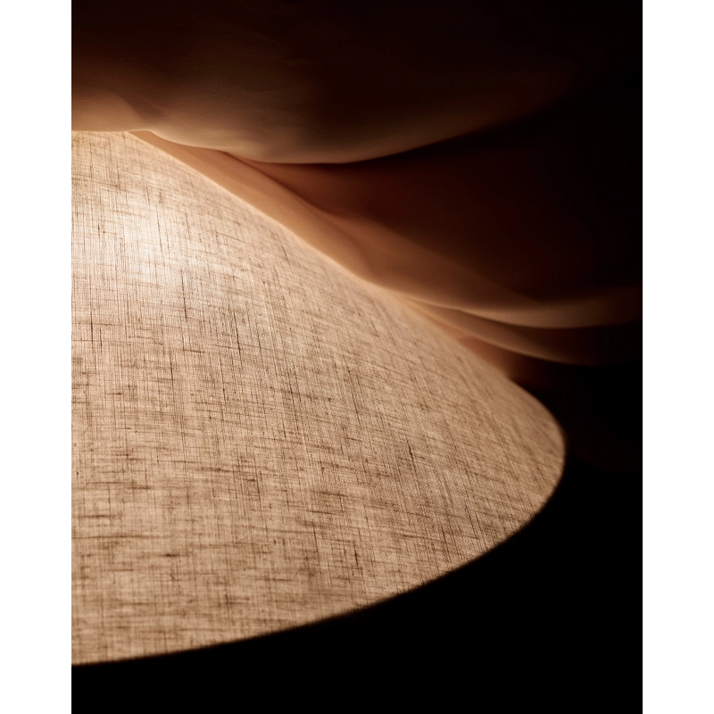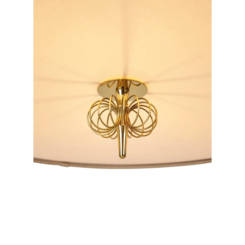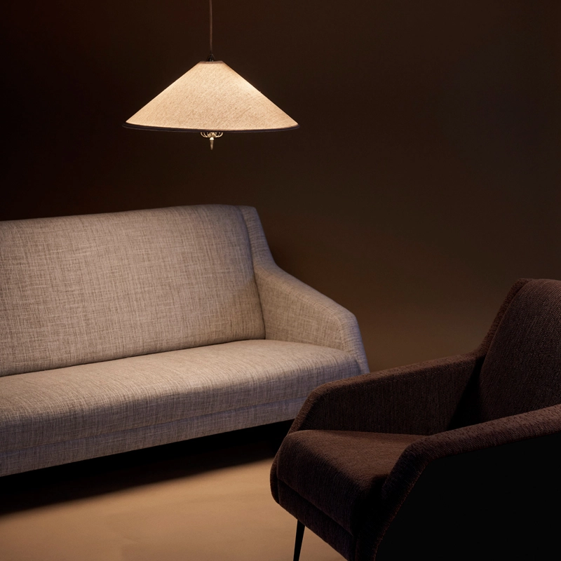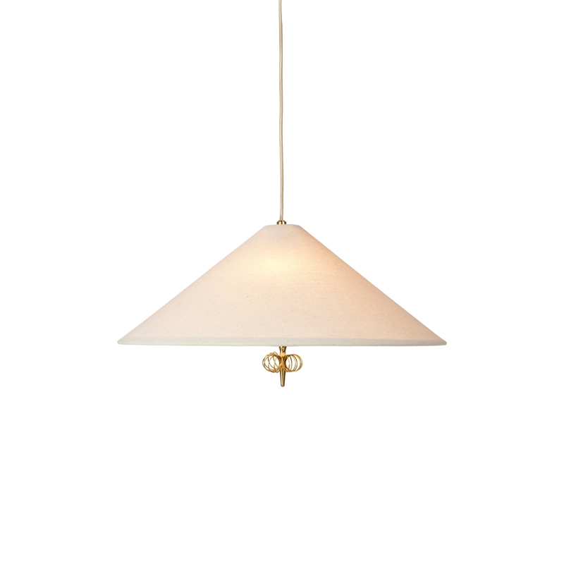 Created by the famous designer Paavo Tynell, the suspension 1967 is a classic from the 1950s. This lamp, reissued by Gubi, features a tapered fabric shade that emits a warm ambient light and Tynell's iconic brass detailing, adding a subtle, high-end expression. Under the bulb, a fabric diffuser modulates the light.