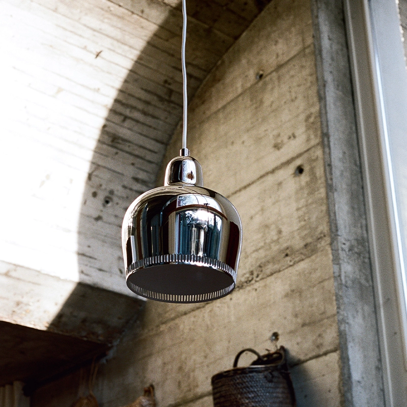 Dubbed the "Golden Bell", the suspension A330S has a sculptural quality that can be appreciated whether the light is on or off. With its golden reflections, the perforated edge of the A330S suspension light creates a memorable halo effect and prevents glare. Crafted from a single piece of brass or steel, the elegant "Golden Bell" was created by Aino and Alvar Aalto for the interior of The Savoy restaurant in Helsinki in 1937 and was subsequently displayed in the Finnish pavilion at the Paris World Fair the same year. Edited by Artek, the "Golden Bell" suspension embodies the clean aesthetic characteristic of Alvar Aalto, while the light it provides is both warm and diffused.